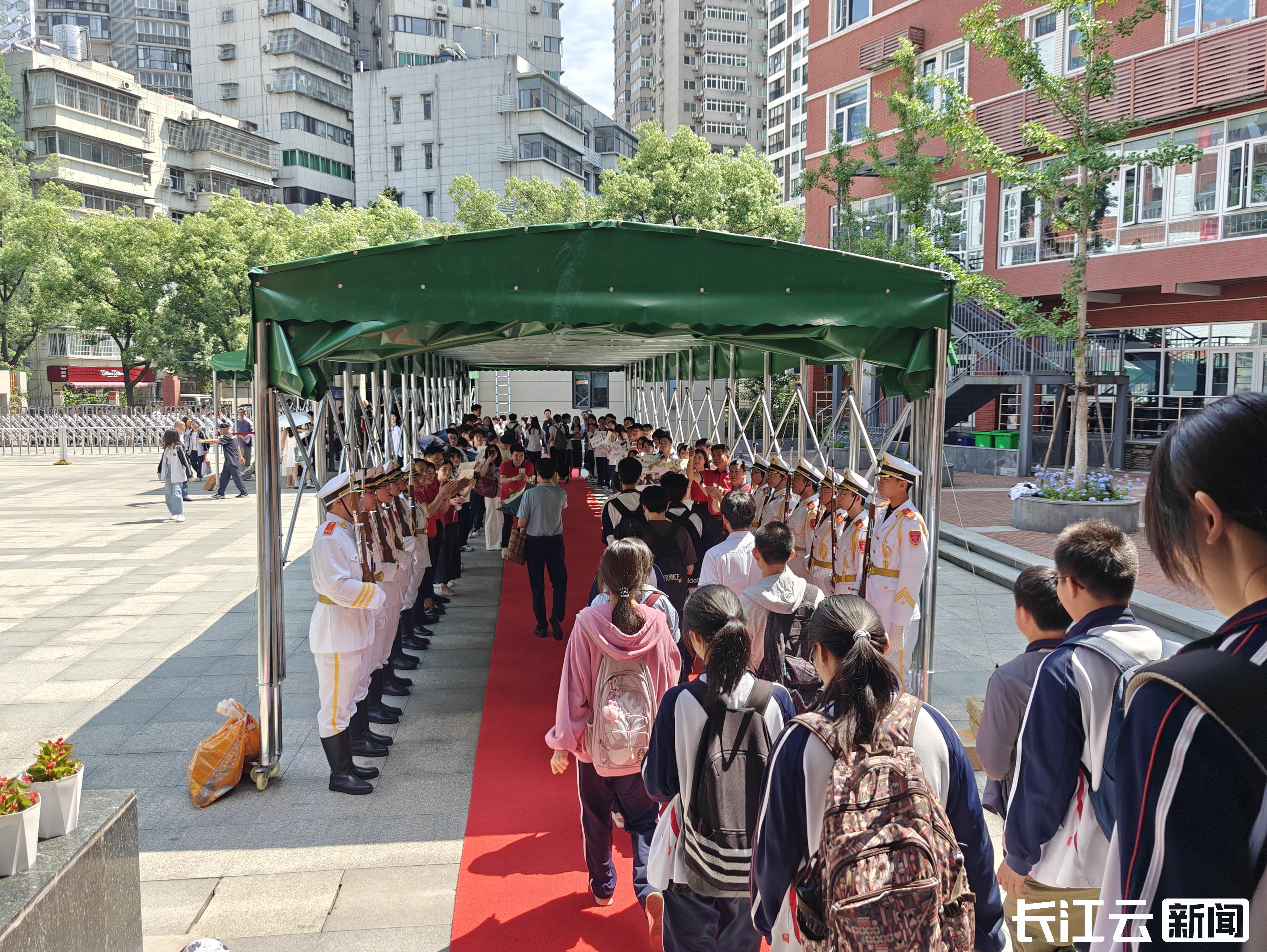 “祝学长学姐前程似锦,未来可期!”6月5日上午,湖北省水果湖高级中学迎来了高三毕业生的离校时刻。上午10时左右,长江云新闻记者在现场看到,该校10个高三毕业班的485名学生们正式上完“最后一课”,离校时,高一、高二的学生以及高三教师们,在校门口列队欢送毕业生,并献上祝福,毕业生与老师们一一拥抱告别。