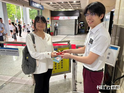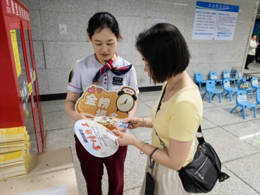6月7日高考首日,在湖北省武汉市黄浦路、宗关、建港、关山大道等地铁站下车前往考场的高考生,收到一份份满载书香祝福的礼物——由湖北省图书馆精心准备的“金榜题名”徽章。