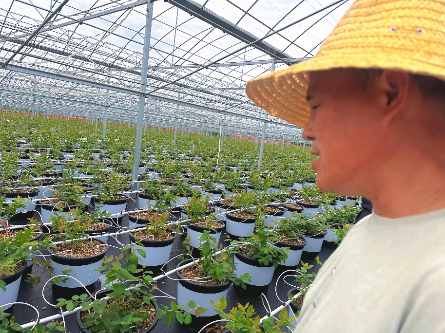 初夏的阳光温柔地洒在大地上,在咸安区向阳湖镇祝垴村湖北国桥农业发展有限公司的蓝莓基地里,钢架大棚错落有致地排列着,像一片片巨大的白色云朵,轻柔地覆盖在翠绿的田野上。棚内,工人王忠福正在巡查苗情,他的身旁是数以万计的盆栽蓝莓。