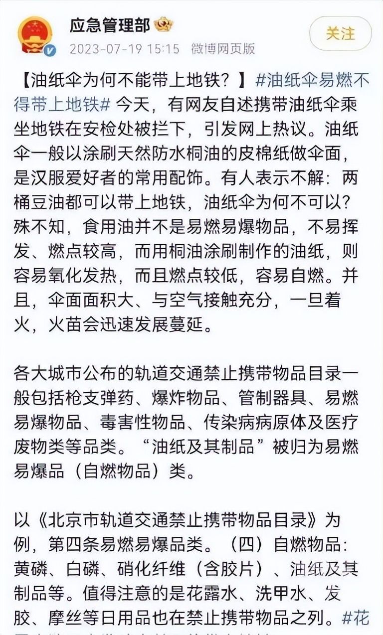 关于油纸伞的易燃特性,早有权威部门作出说明。2023年7月,国家应急管理部官方微博科普油纸伞不能带上地铁的原因。从全国范围来看,各大城市轨道交通禁止携带物品目录通常涵盖枪支弹药、爆炸物品、管制器具、易燃易爆物品等多个品类,“油纸及其制品”均被归为易燃易爆品(自燃物品)类。以《北京市轨道交通禁止携带物品目录》为例,其第四条就明确将油纸及其制品列为易燃易爆品中的自燃物品,此外,花露水、洗甲水、发胶、摩丝等日用品也在禁止携带之列。