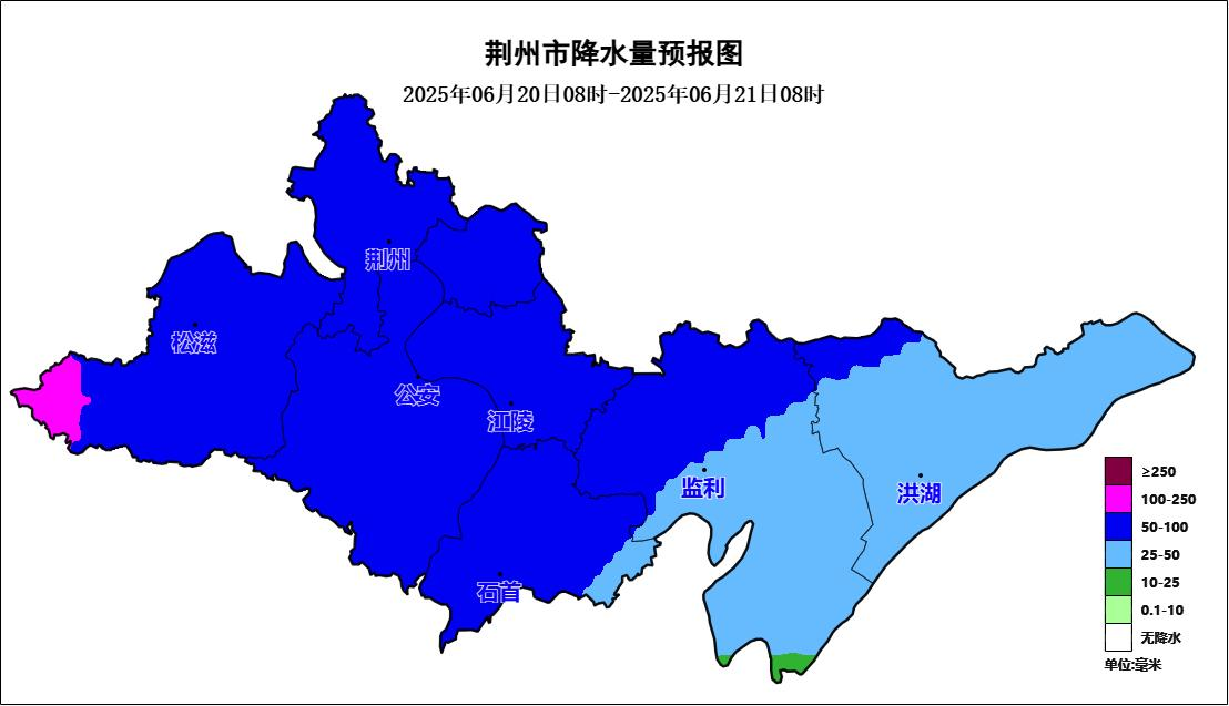 1. 荆州市6月19日08时至6月20日08时累计降雨量预报图