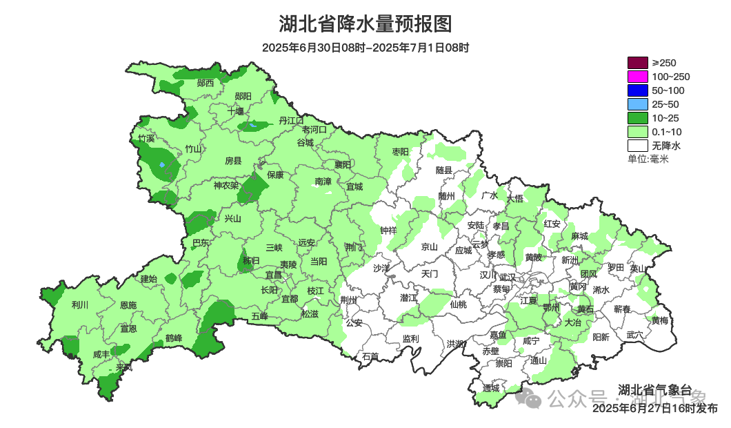 6月30日08时-7月1日08时,鄂西北、鄂西南多云有阵雨或雷阵雨,局地伴有短时强降水、雷暴大风等强对流天气;其他地区多云,午后局地有阵雨或雷阵雨。最高气温西部29~33℃、中东部33~36℃,最低气温西部23~26℃、中东部26~29℃,偏南风3到4级、阵风5到6级。