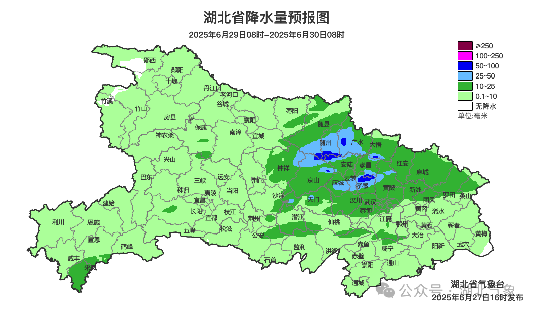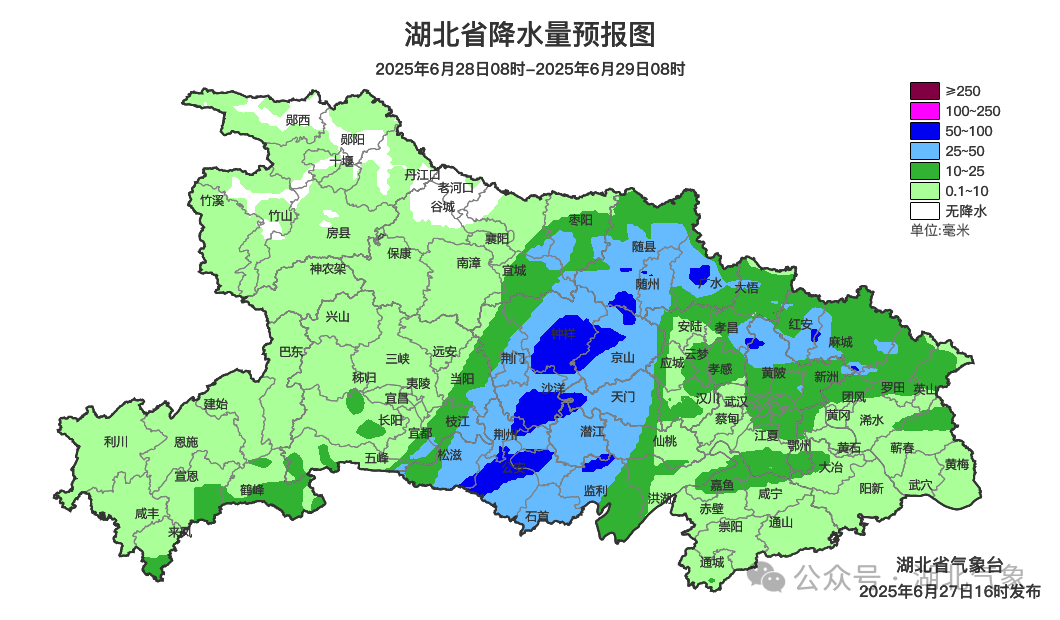 6月28日08时-29日08时,鄂西北东部、江汉平原、鄂东北阴天有分散性大雨到暴雨;其他地区多云有阵雨或雷阵雨。省内局地伴有短时强降水、雷暴大风等强对流天气。最高气温鄂西北、鄂东南32~35℃、其他地区29~32℃,最低气温21~26℃,偏南风3到4级、阵风5到7级。