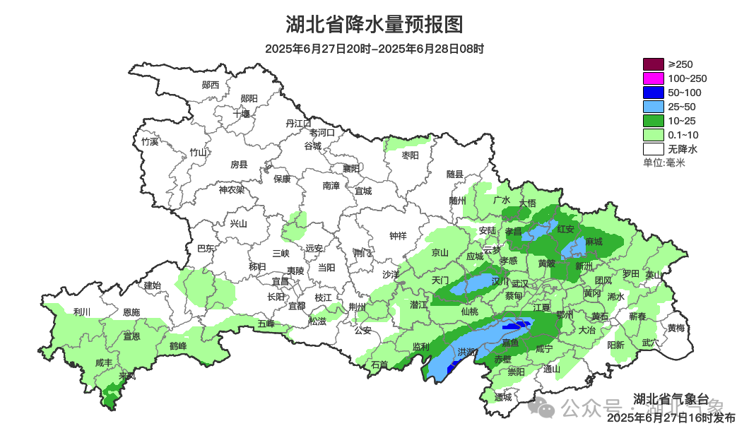 6月27日20时-28日08时,江汉平原东部、鄂东北、鄂东南阴天有阵雨或雷阵雨,局地大雨或暴雨;其他地区多云,局地有阵雨或雷阵雨。省内局地伴有短时强降水、雷暴大风等强对流天气。最低气温21~26℃,偏南风3到4级、阵风5到6级。