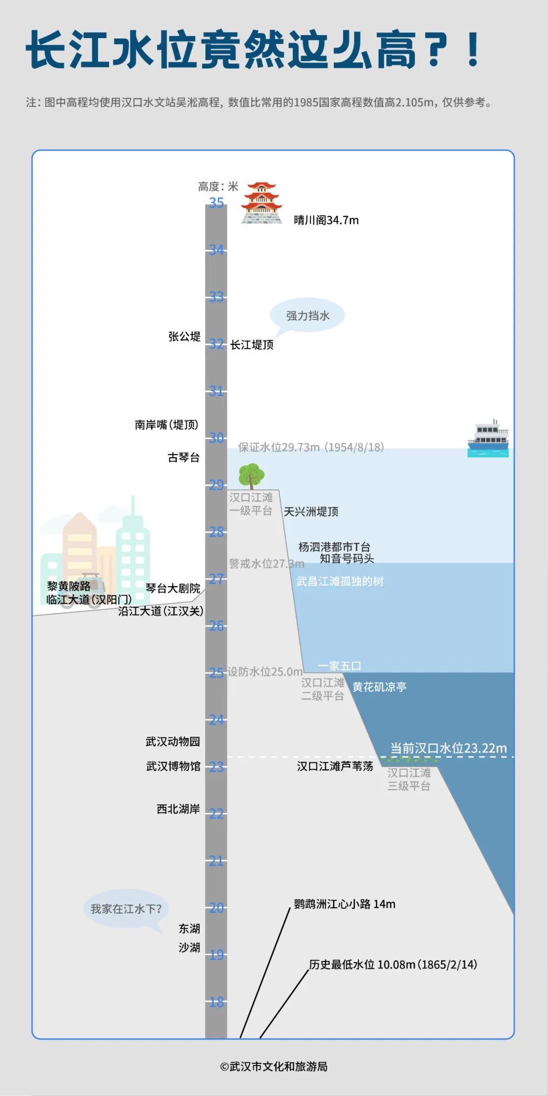 △把武汉各地放在高度尺上,会发现长江水位比不少地方都高