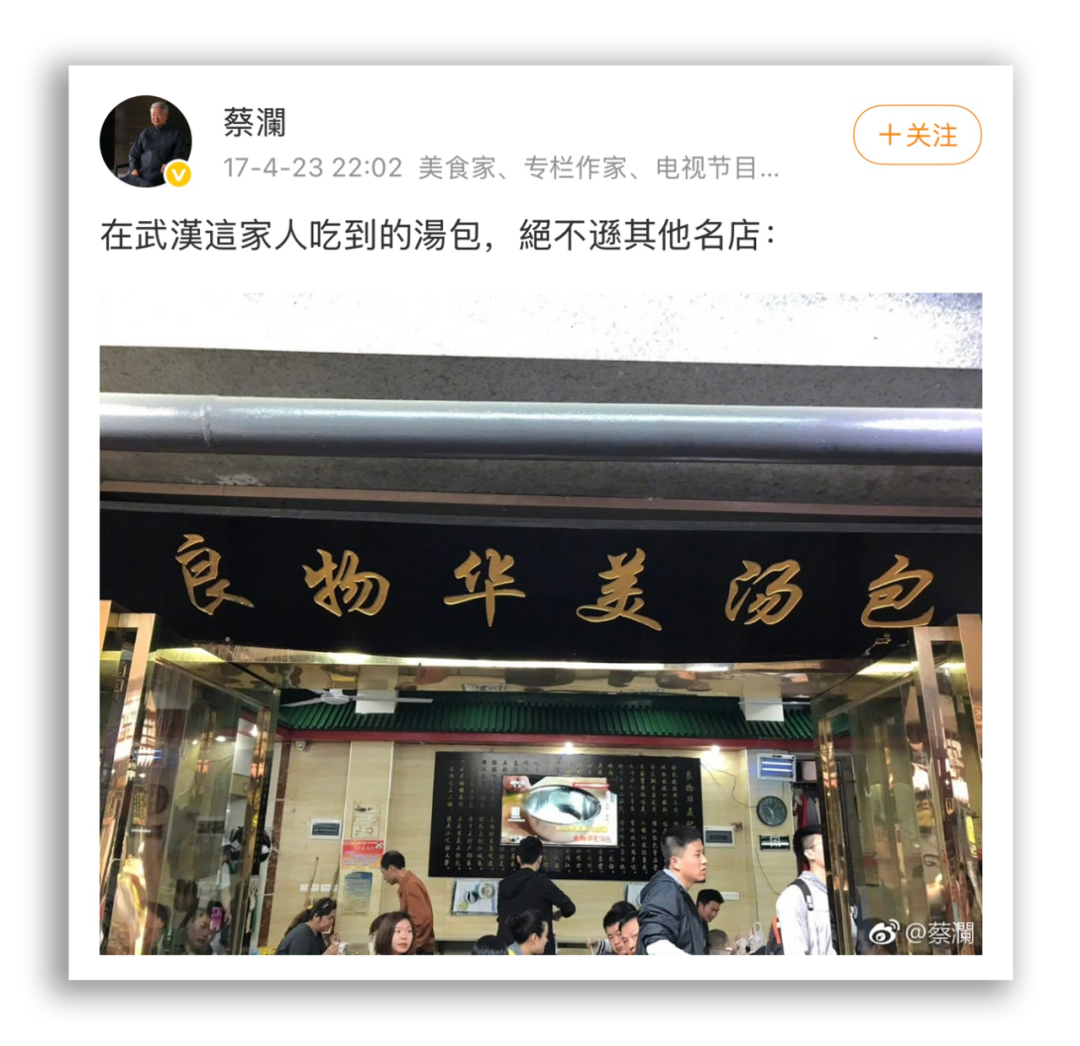 除了2013年的美食之旅,蔡澜先生还于2017年再次寻味湖北,到武汉雪松路品尝了腰花粉、汤包、锅盔,在楚鱼王品尝了湖北的全鱼宴。