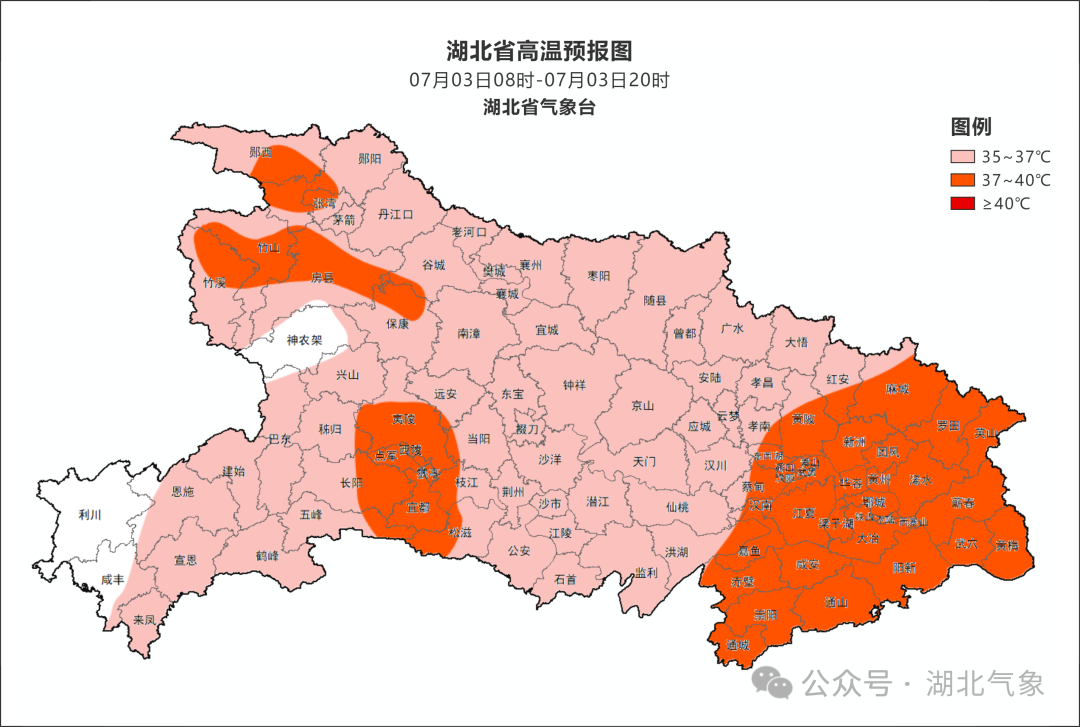 预计7月3日白天,除神农架和恩施高海拔山区外,湖北省大部分地区最高气温将升至35℃以上,其中十堰、襄阳、宜昌、武汉、鄂州、黄冈、黄石、咸宁局地可达37℃以上,请注意防范。