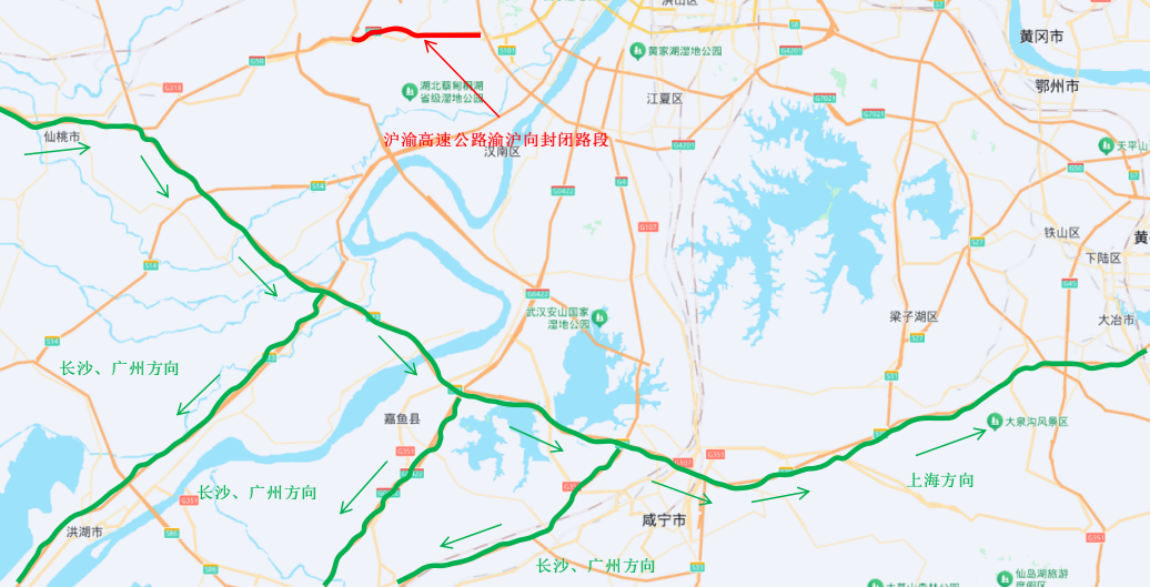 2.上海方向:G50沪渝高速仙桃枢纽互通—S43孝洪高速—S78蕲嘉高速(东向行驶)