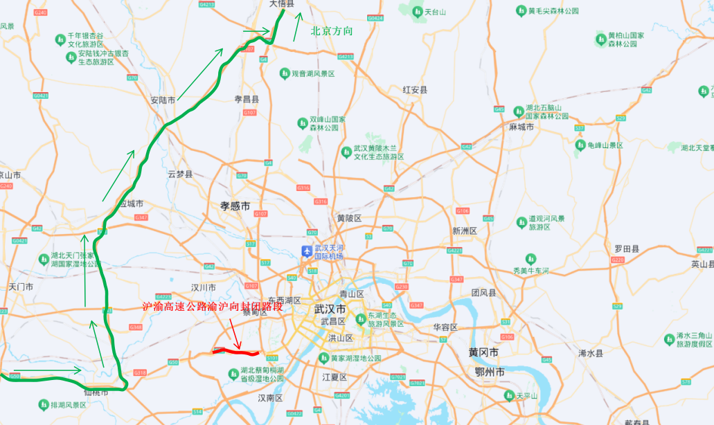 2.北京方向(2):G50沪渝高速仙桃枢纽互通—S43孝洪高速—G4213麻安高速—G4京港澳高速(北上行驶)
