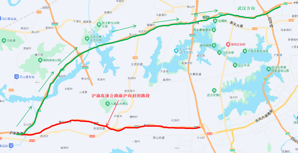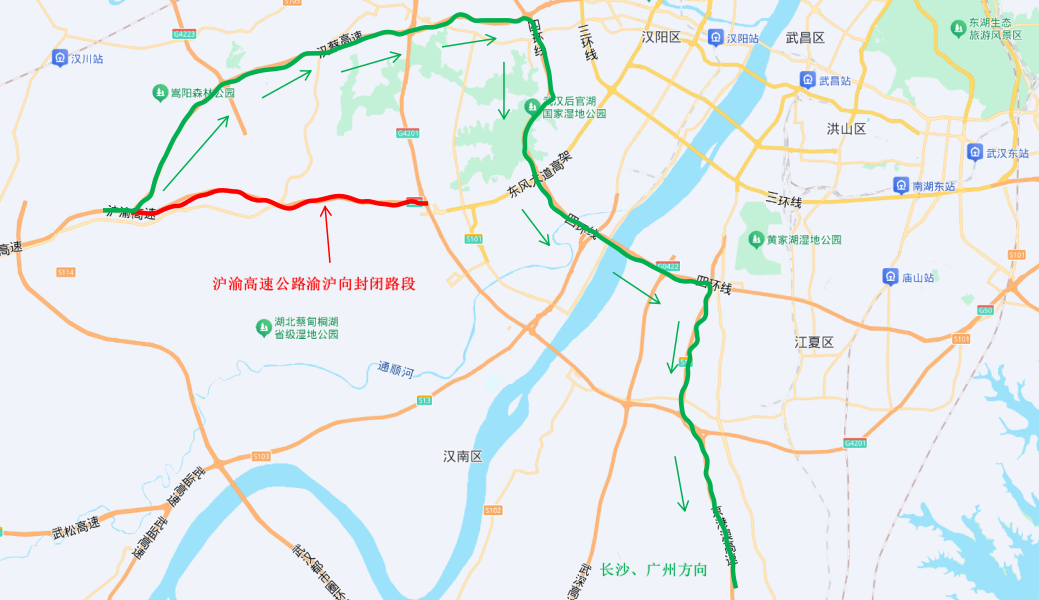 武汉方向:G50沪渝高速侏儒枢纽互通—S15汉蔡高速琴台收费站(东向行驶)