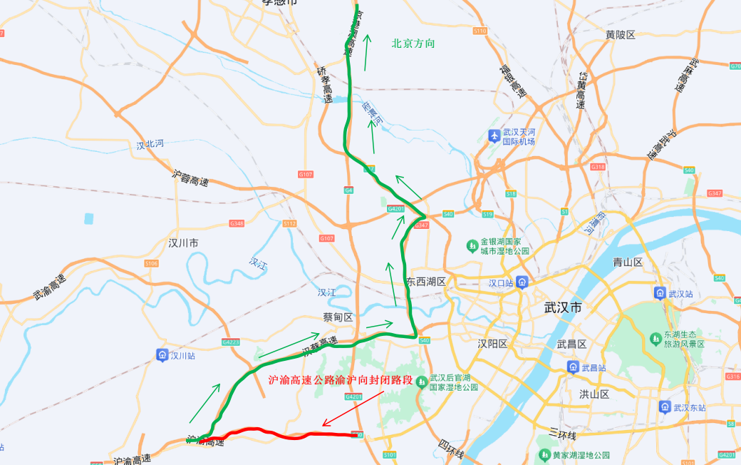 1.北京方向(1):G50沪渝高速侏儒枢纽互通—S15汉蔡高速—四环线—S17硚孝高速—G4京港澳高速(北上行驶)