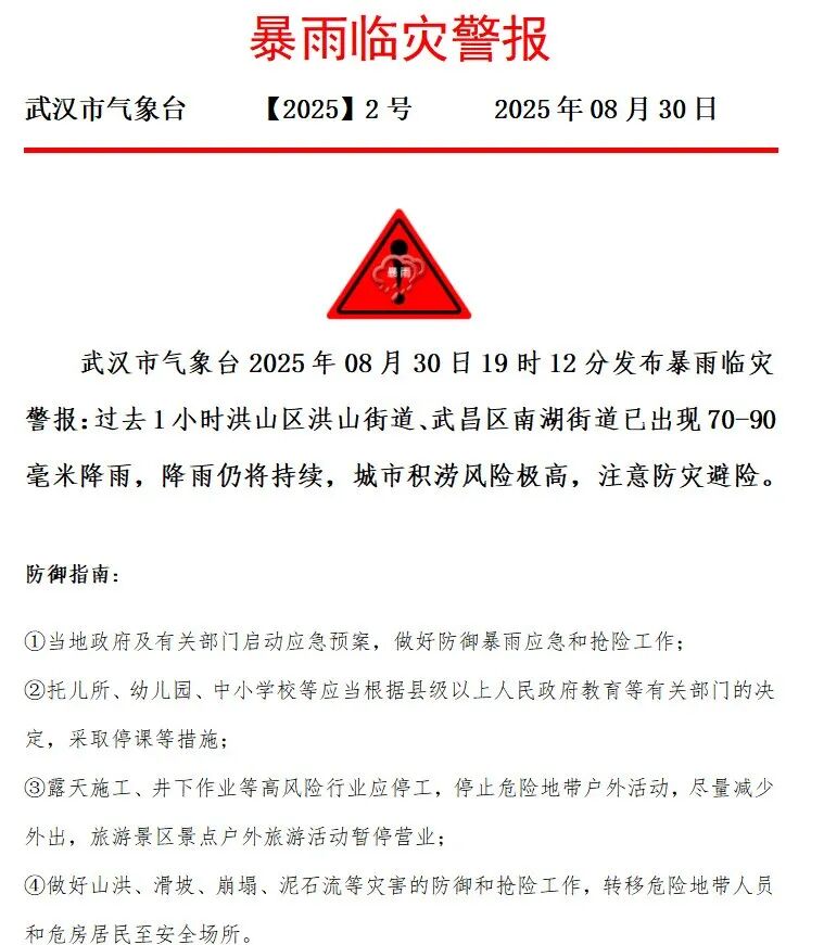 刚刚,武汉发布暴雨临灾警报!少出门