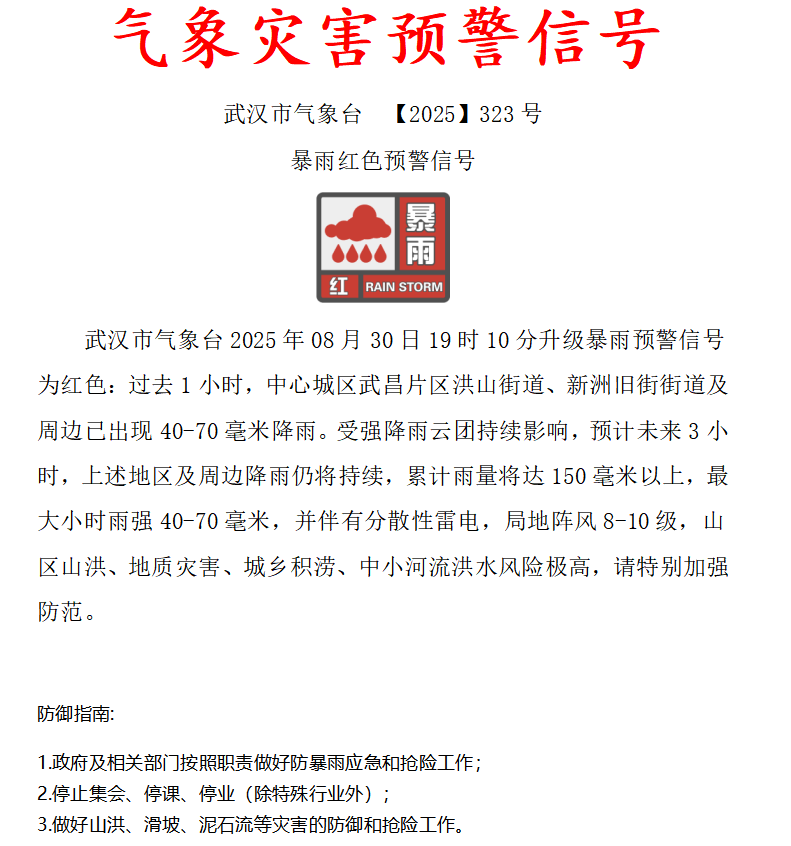 19时10分,武汉市气象台升级暴雨预警信号为红色。