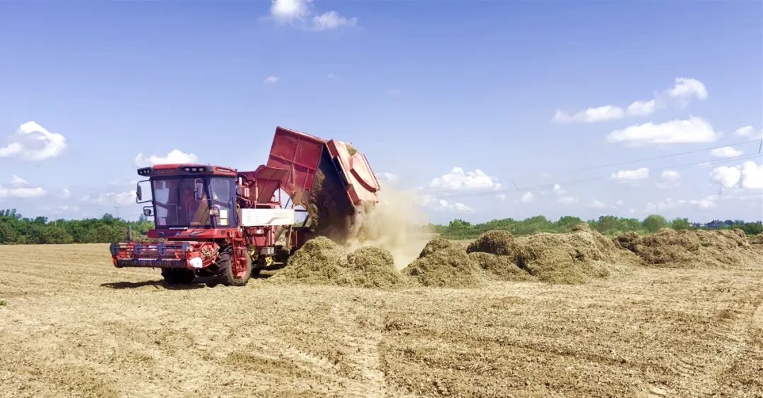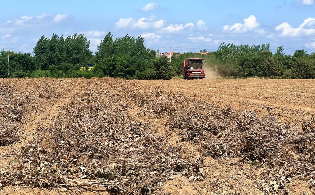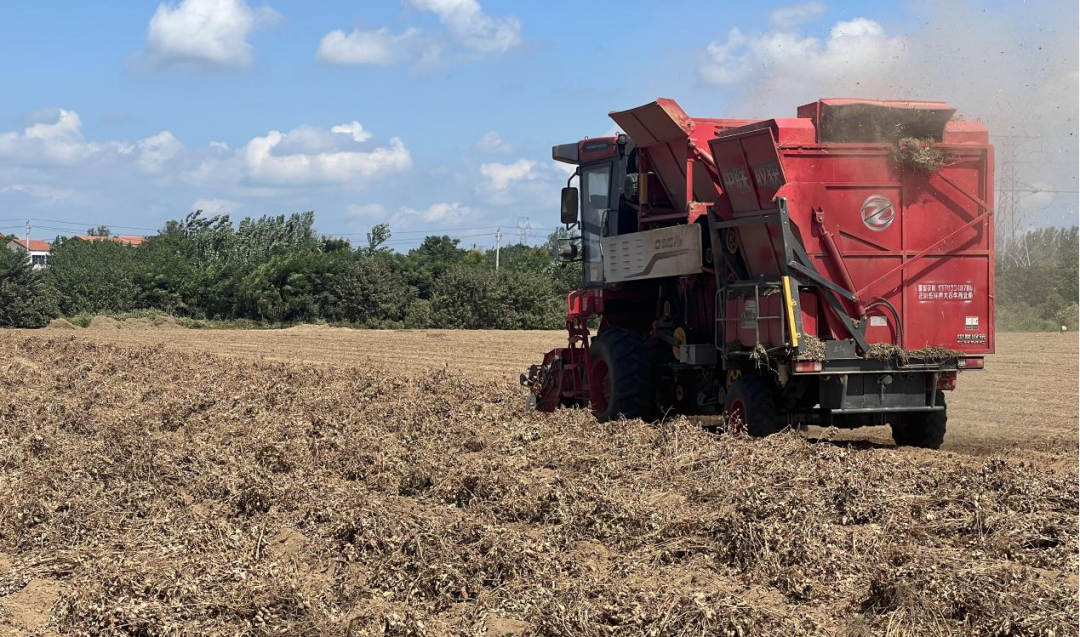 在三合村的花生种植基地,联合收割机在田间往来作业,一项“一举两得”的农事操作同步开展。机械高效分离出饱满的花生果后,随即对剩余的花生秧进行就地粉碎处理。这些粉碎后的秧苗不再被随意丢弃或焚烧,而是由种植户仔细收集装车,送往周边养殖场。
