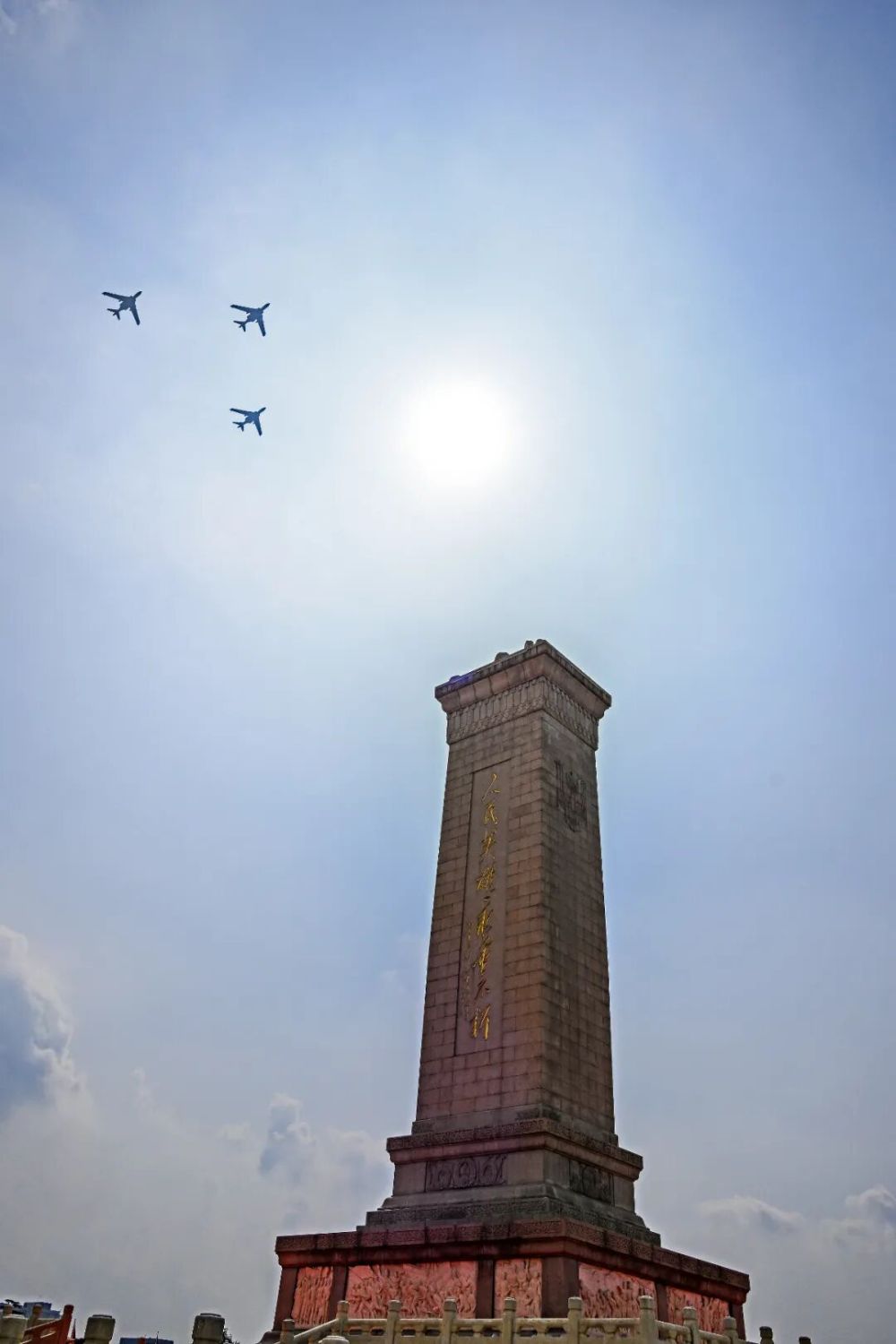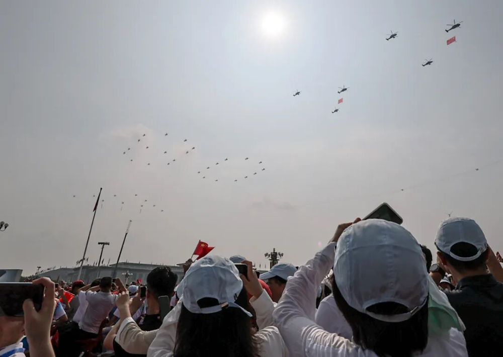 9月3日,纪念中国人民抗日战争暨世界反法西斯战争胜利80周年大会在北京隆重举行。这是观众拍摄空中护旗梯队通过天安门广场。新华社记者 欧东衢 摄