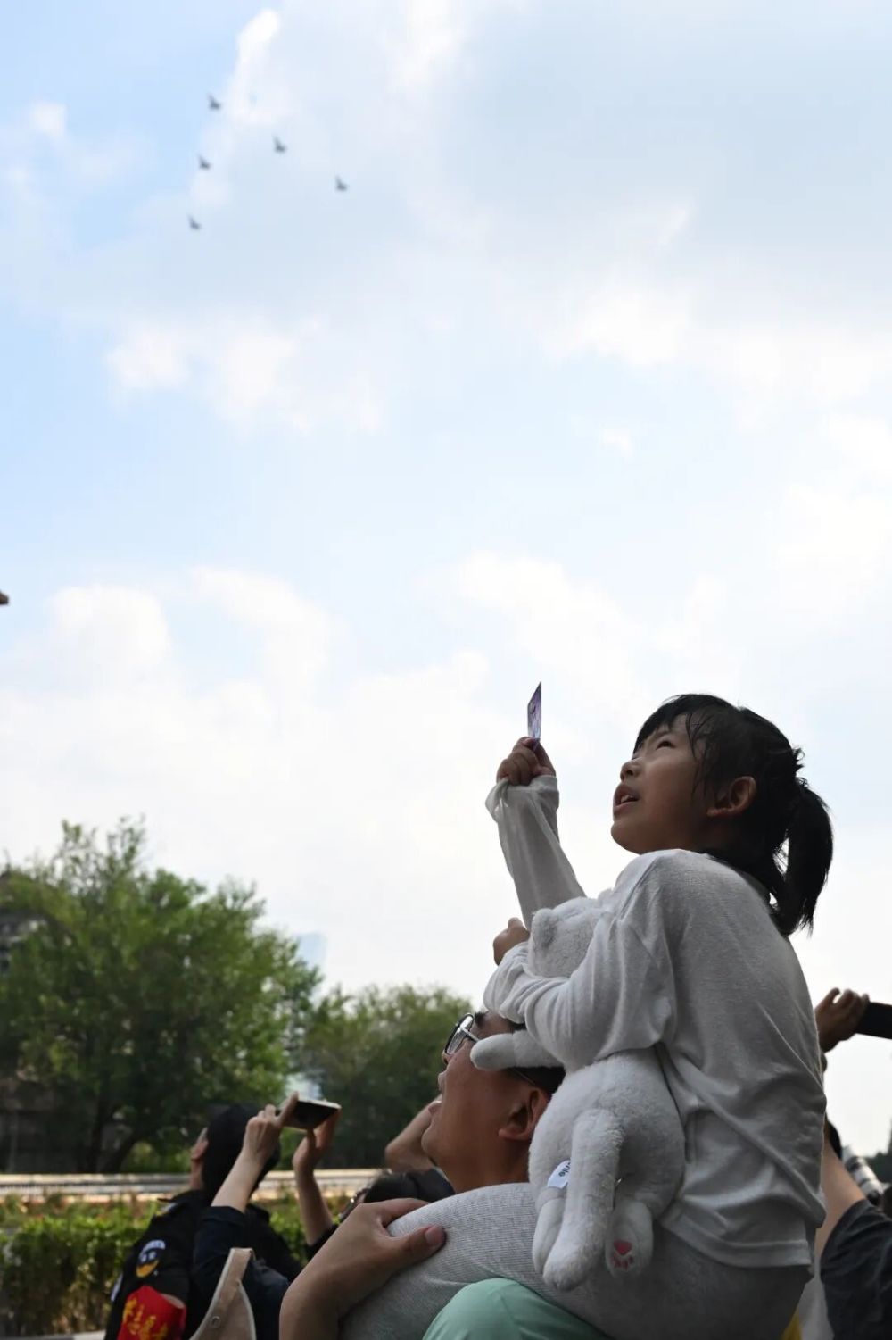 9月3日,纪念中国人民抗日战争暨世界反法西斯战争胜利80周年大会在北京隆重举行。这是市民在观看空中梯队。新华社记者 陈浩明 摄