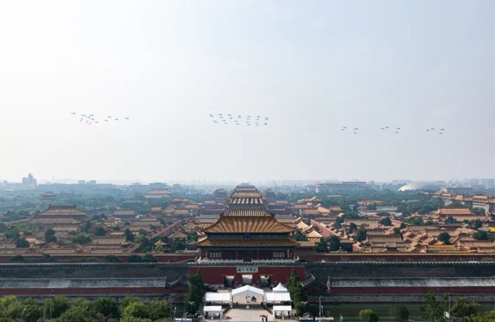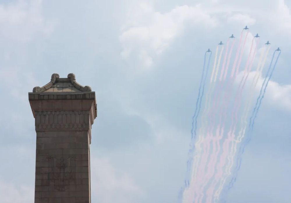 9月3日,纪念中国人民抗日战争暨世界反法西斯战争胜利80周年大会在北京隆重举行。这是在北京天坛公园拍摄的教练机梯队。新华社记者 赵子硕 摄