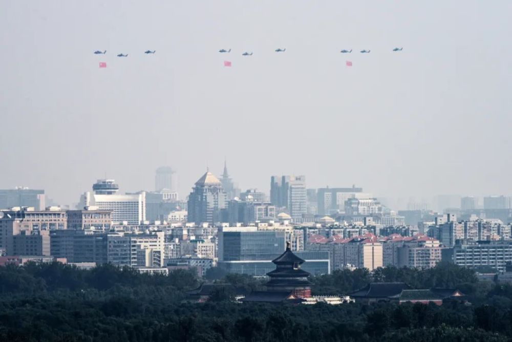 9月3日,纪念中国人民抗日战争暨世界反法西斯战争胜利80周年大会在北京隆重举行。这是空中护旗梯队通过天安门广场。新华社记者 杜宇 摄