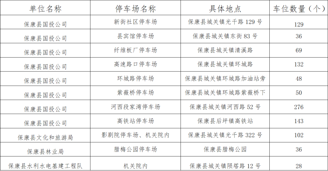 限时免费对外开放停车场属于公益行为,不承担车辆事故损毁及车内物品被盗等所致的相关赔偿责任。 请全县广大市民朋友绿色低碳出行,主动礼让停车位,展示好客保康形象。