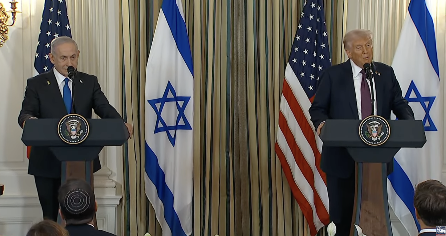 当地时间9月29日,美国总统特朗普与以色列总理内塔尼亚胡举行双边会晤后,双方举行记者发布会,但没有接受记者提问。