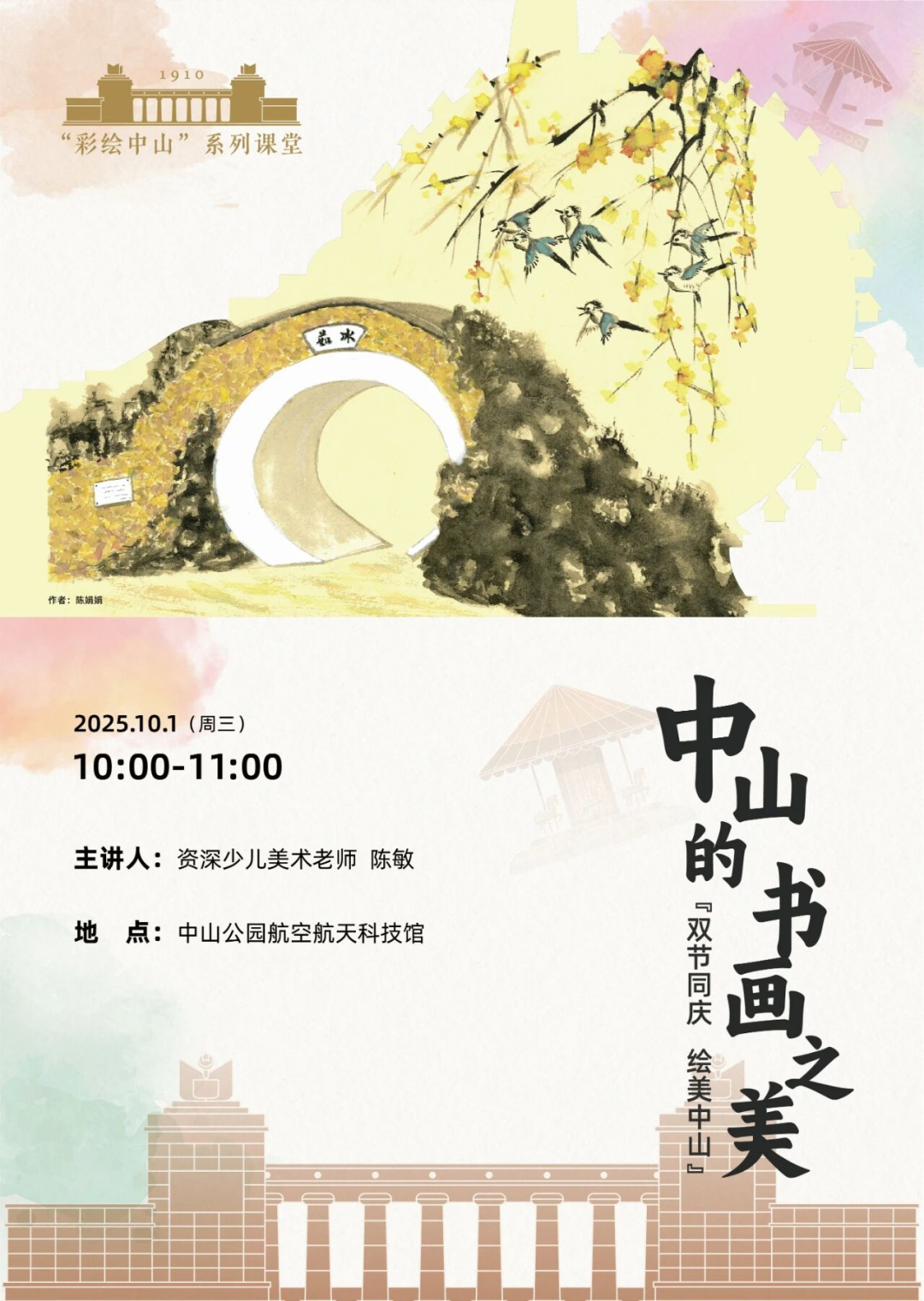10月1日,《彩绘中山》系列课程带大家体验“人在画中游,画在景中展”。青少年们将参观书画展,再用丙烯马克笔描绘心中的“节日中山”。