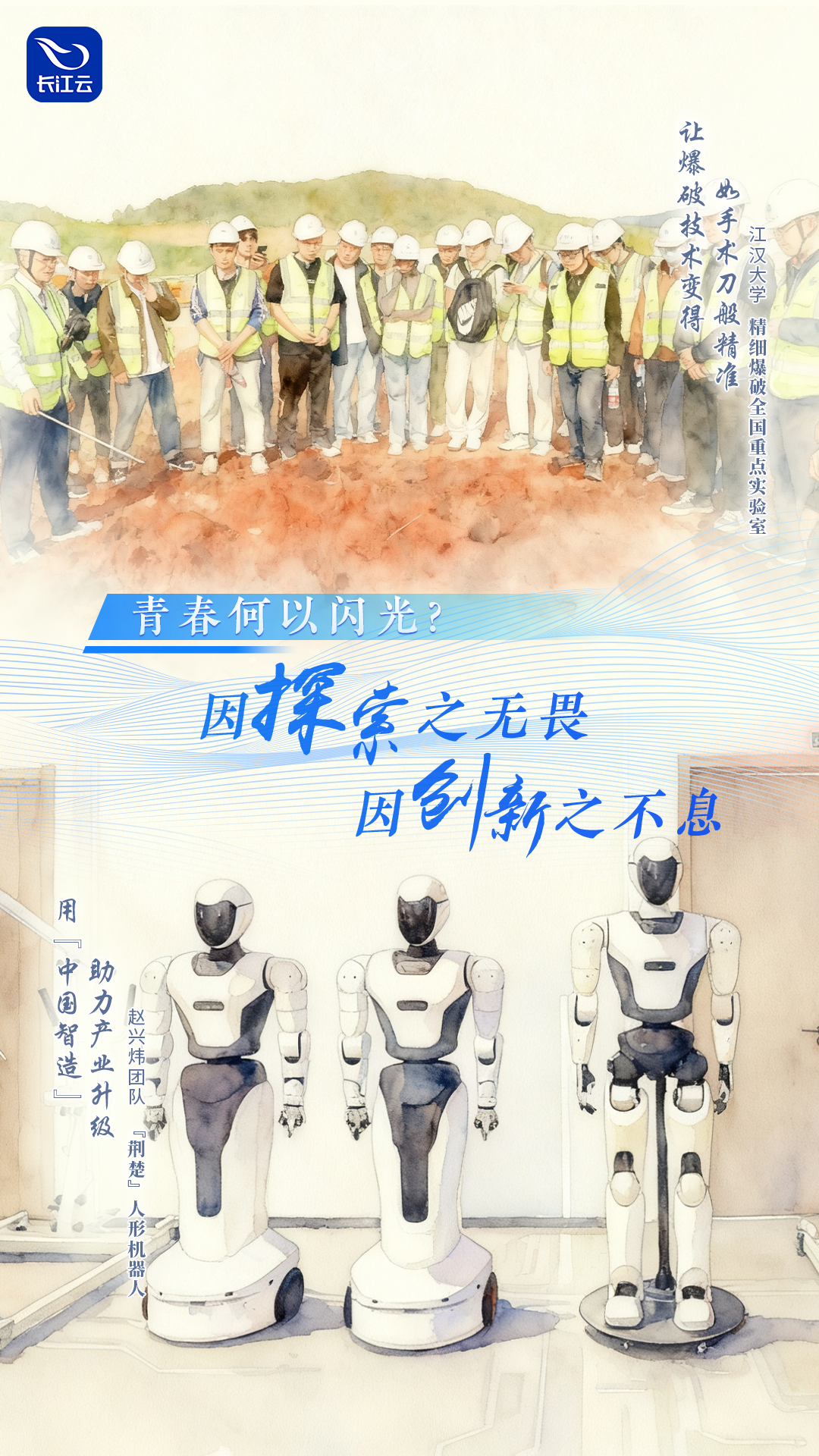 在江汉大学精细爆破全国重点实验室里,年轻的科研团队与“微秒”和“毫米”较劲,让爆破技术变得如手术刀般精准。他们用看似最“刚”的方式,实现了最“柔”的控制,为城市经济建设与国家重大工程保驾护航;青年工程师赵兴炜与团队攻坚克难,研发的“荆楚”人形机器人不仅打破国外技术垄断,还成功应用于汽车制造、电子产业等领域,用“中国智造”助力产业升级。