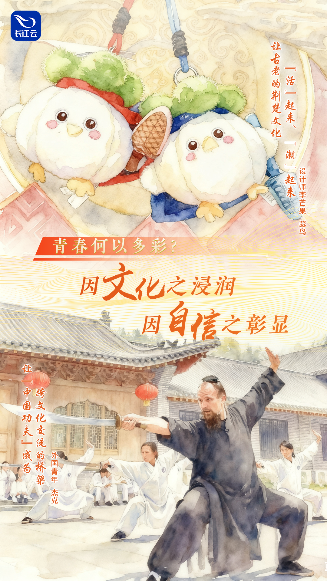 “蒜鸟”一叫,全网“上头”。这只长着蒜头鼻子、武汉话十级的绿皮小鸟,在海外社交媒体引发“中国风”热潮。它的设计师李芒果,将曾侯乙编钟、楚庄王典故、武汉地标等厚重的文化符号,化作了年轻人爱不释手的文创产品,让荆楚文化“活”起来、“潮”起来;武当山巅,外国青年“杰克”拜师学习武当武术,他不仅自己苦练太极,还通过短视频平台向海外网友展示武当文化的魅力,让“中国功夫”成为跨文化交流的桥梁。