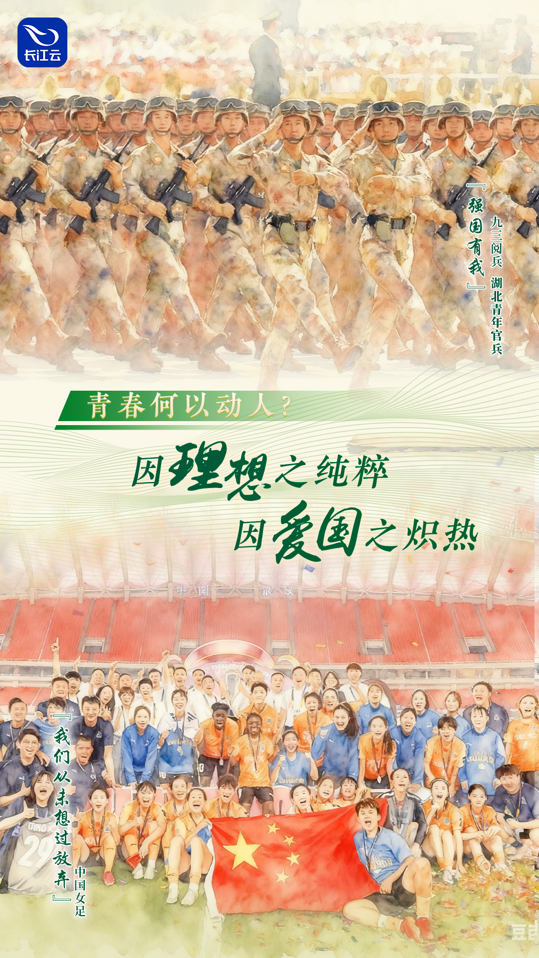 绿茵场上,中国女足队员王霜一次次在关键时刻挺身而出,用精准的射门和顽强的突围诠释“铿锵玫瑰”的拼搏精神。她那句“我们从未想过放弃”,不仅是个人的高光,更是为国争光、为家乡添彩的信念迸发;“九三阅兵”上,那些步伐铿锵、眼神坚定的湖北青年官兵,挺拔的身姿里藏着“强国有我”的誓言,用青春的姿态向祖国致敬。