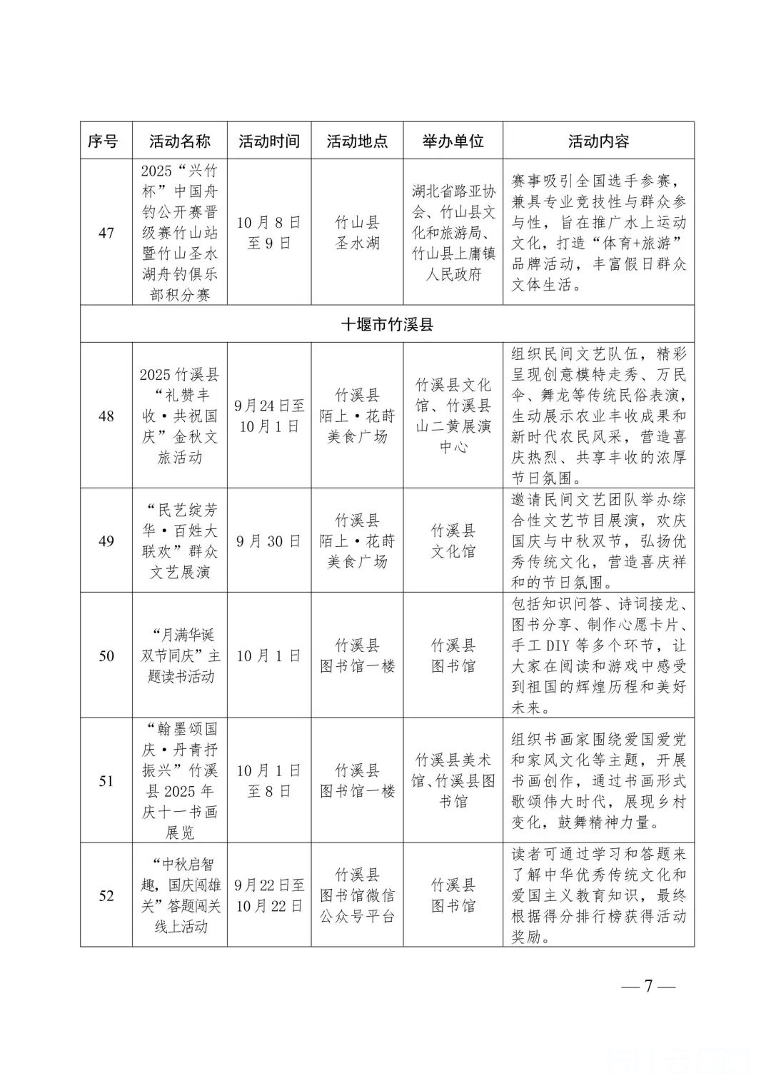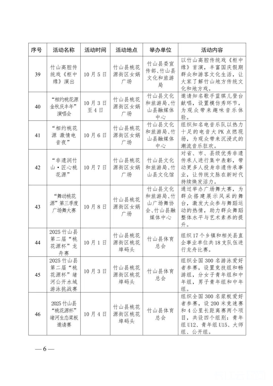 非遗文化体验:10月1日至8日,景区内设非遗文化展览区,展示竹山县十多个类别200余件非遗作品,并有专业讲解。