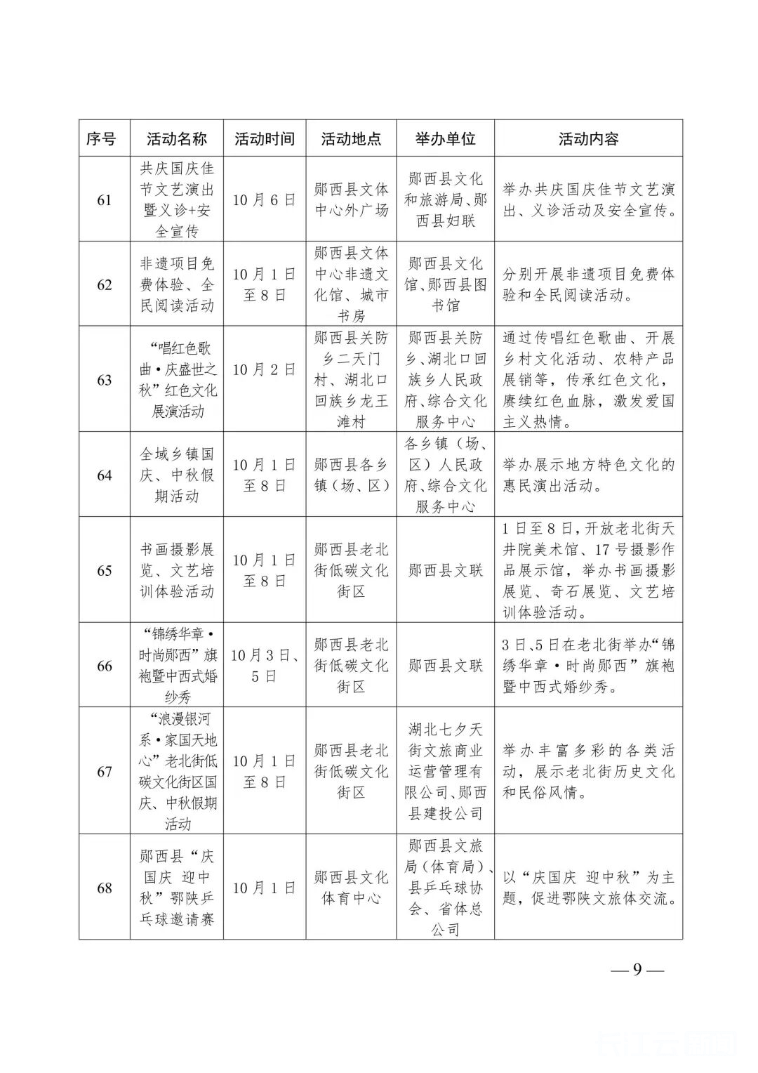 文化展览与演艺:包括《诗韵九雅》书册展、AK-47老猫乐队演唱会、《烽火土城门》情景剧公演等。