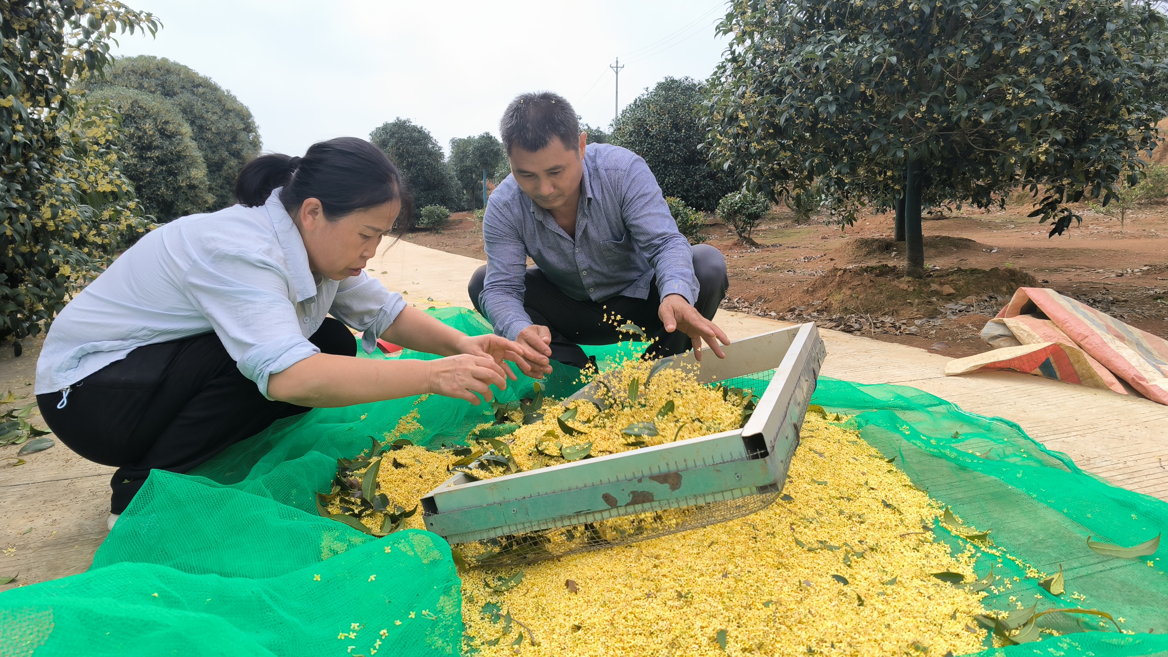 这片生机盎然的金桂林,更是当地人眼中实实在在的“致富林”。每到桂花开得最盛的时节,村民们便扛着振动式采花机、握着竹竿,提着彩条布走进林间。他们先小心翼翼地将彩条布在树下铺展平整,随后把采花机钩在树梢启动电机,或用竹竿轻轻敲打枝干,“哗啦”声里,金黄的花瓣裹挟着少量叶片如雨般落下,在彩条布上堆起一层厚厚的“金粉”。筛选干净的鲜桂花香气愈发浓郁,每一缕芬芳里,都寄托着花农们沉甸甸的致富梦想。