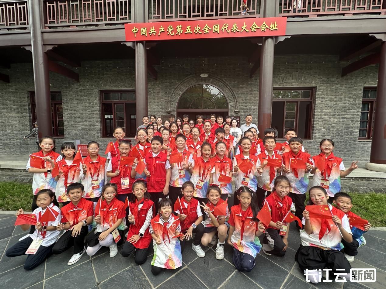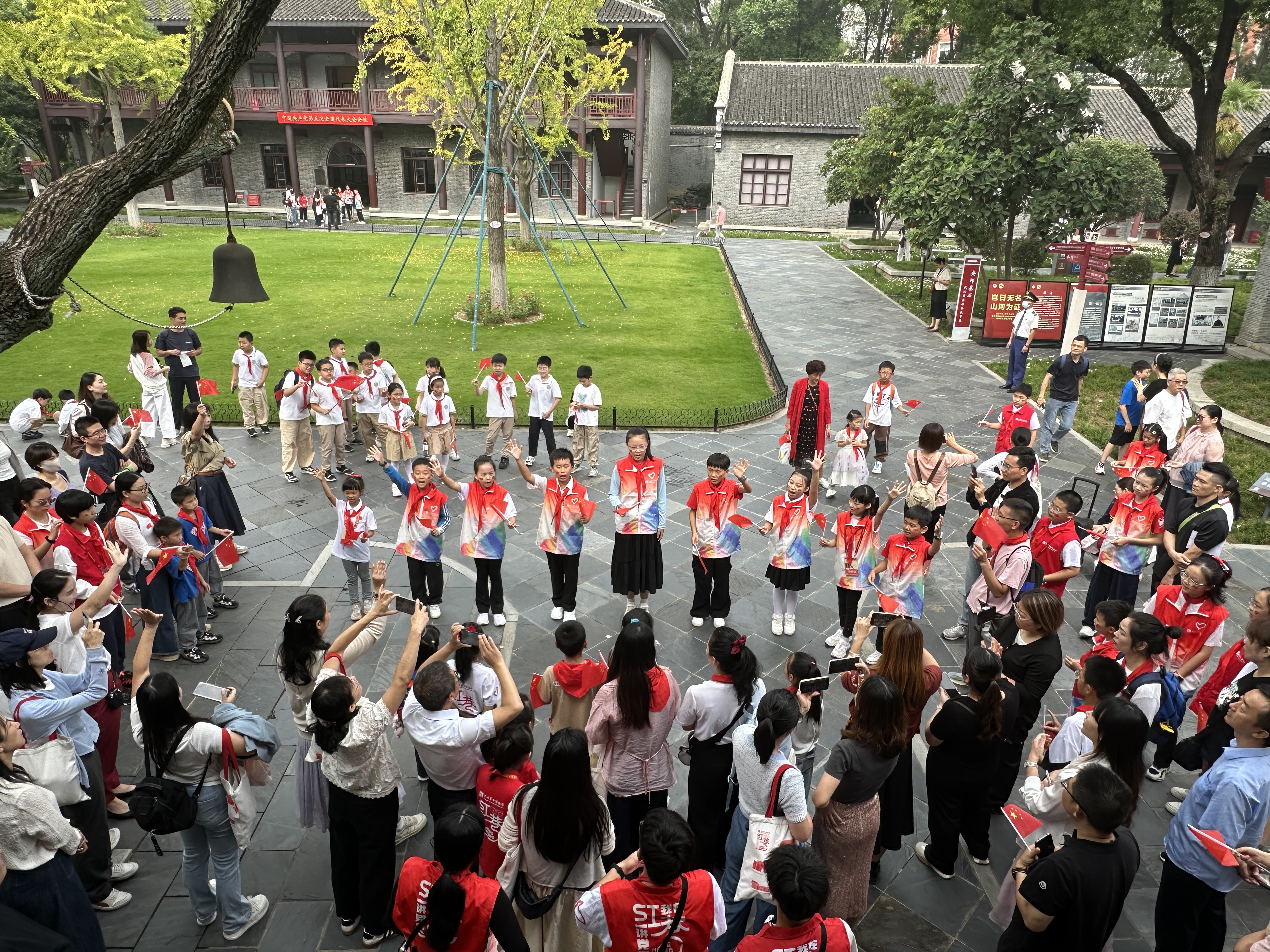 20余名表演者手持红旗,以一首《我的祖国》深情开唱,“一条大河波浪宽”的悠扬旋律瞬间吸引游客驻足。步入纪念馆院落,铿锵有力的《团结就是力量》随即响起,“红巷苗苗”们并肩而立,以饱满的童声展现万众一心的力量,仿佛将观众带回烽火连天的抗战年代。随后,《游击队歌》《没有共产党就没有新中国》等歌曲在纪念馆各处回响。活动尾声,全体参演者汇聚于中共五大会址开幕式会场门口,红旗挥动,歌声清澈嘹亮,一曲《歌唱祖国》大合唱将气氛推向高潮,演唱者们带领观众齐声高歌,用最真挚的歌声诉说对祖国的深情。