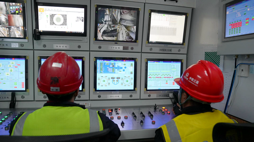 10月2日,在2标段6号平洞内,“江汉平安号”TBM的刀盘正匀速转动,切削下的岩石碎屑通过传输带快速运出,掘进、管片拼接等工序在智能系统调控下有序进行。