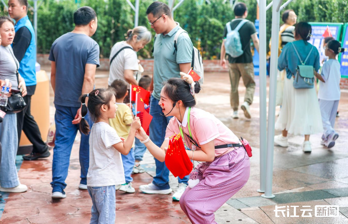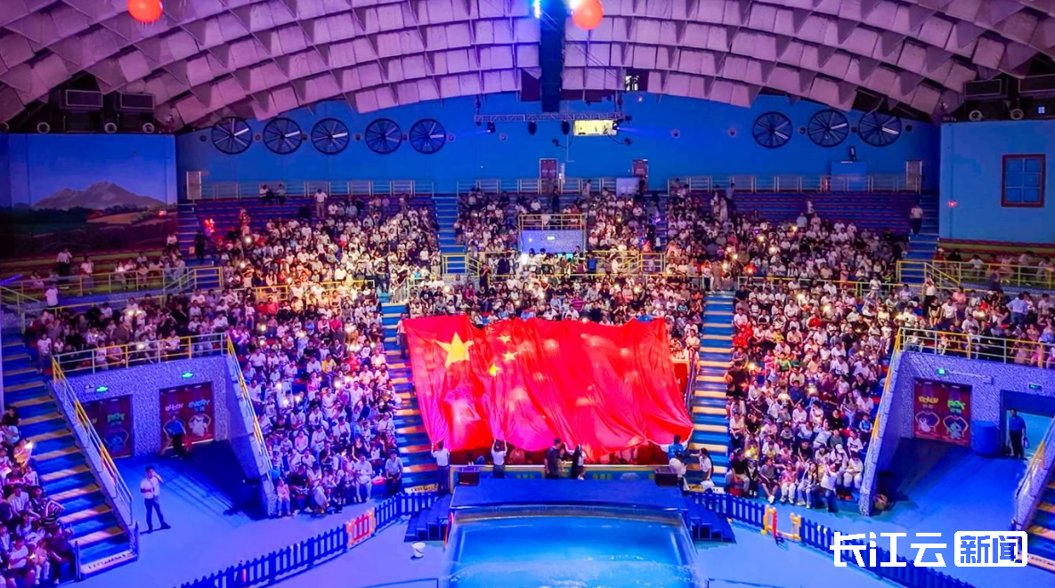 步入武汉极地海洋度假区,入口处巨幅国旗在阳光下格外耀眼,“海洋蓝” 与 “中国红” 交相辉映,瞬间点燃游客的爱国热情。海洋剧场内,“千人传国旗、万人唱红歌” 活动掀起高潮 —— 鲜艳的五星红旗在不同年龄、不同地域的游客手中缓缓传递,《我和我的祖国》等经典旋律在场馆内久久回荡,不少游客自发挥舞小国旗,跟着节奏齐声合唱,现场汇成红色海洋。