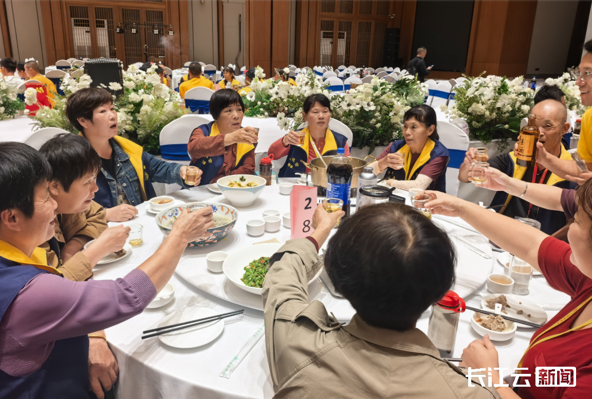 当晚,武当一梦广场摆起200多席的千人宴,欢迎远道而来的闽台游客。2700名游客围坐共进晚餐,共同品尝武当特色菜肴、同饮房县黄酒。天空虽然飘着雨,却丝毫不减游客们的热情,不少游客品尝后现场下单选购,并留下工作人员联系方式。