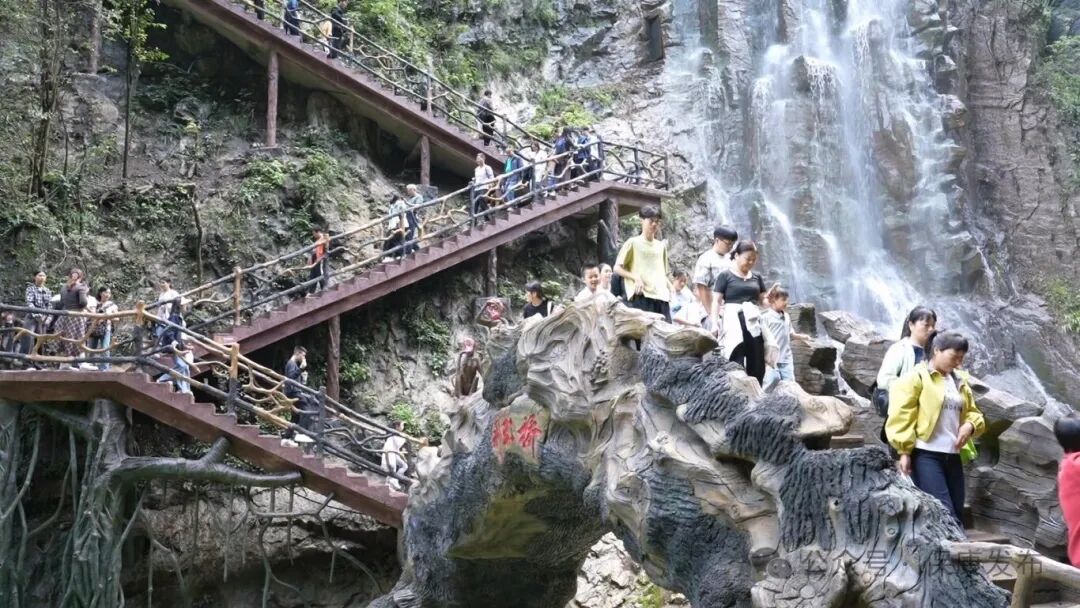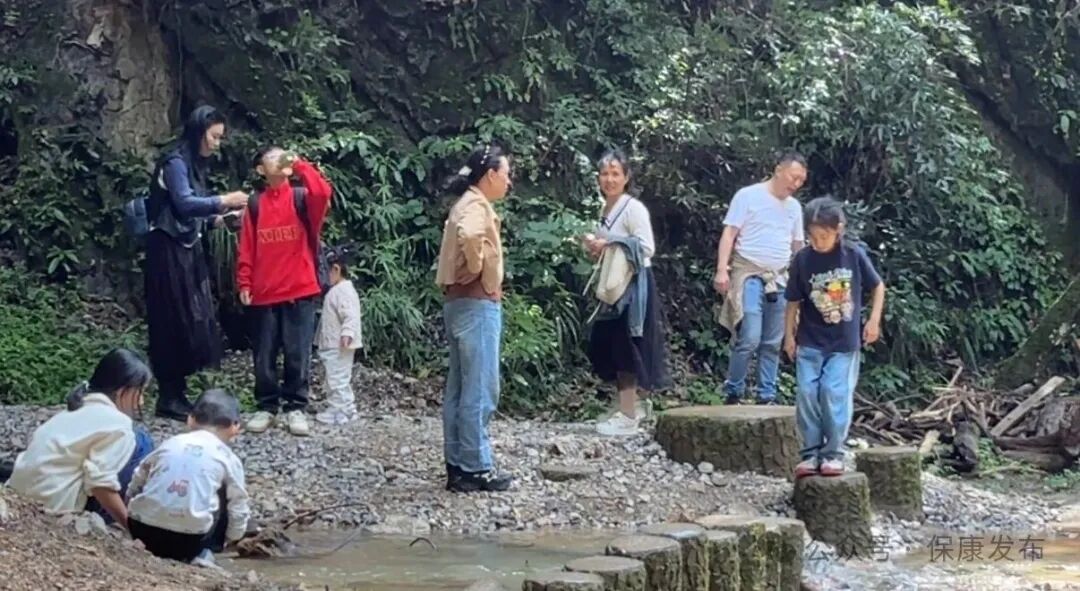 蜿蜒的步道上,徒步爱好者们拾级而上,尽情呼吸着“森林氧吧”特有的清新空气。孩子们在浅溪边嬉戏玩水,清澈的溪流声与纯真的笑语声交织,为幽静的峡谷增添了无限生机与乐趣。