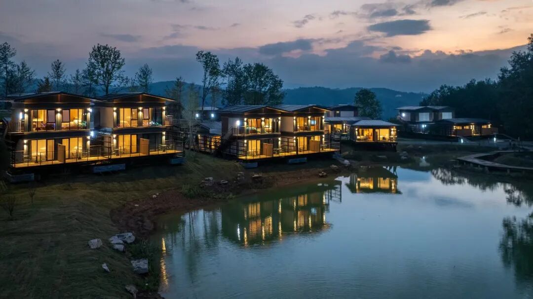 官山世外茶源里,特色童话小木屋、霍比特小屋错落分布,围炉煮茶的闲适体验搭配山野风光,成为游客慢享田园时光的热门打卡地。