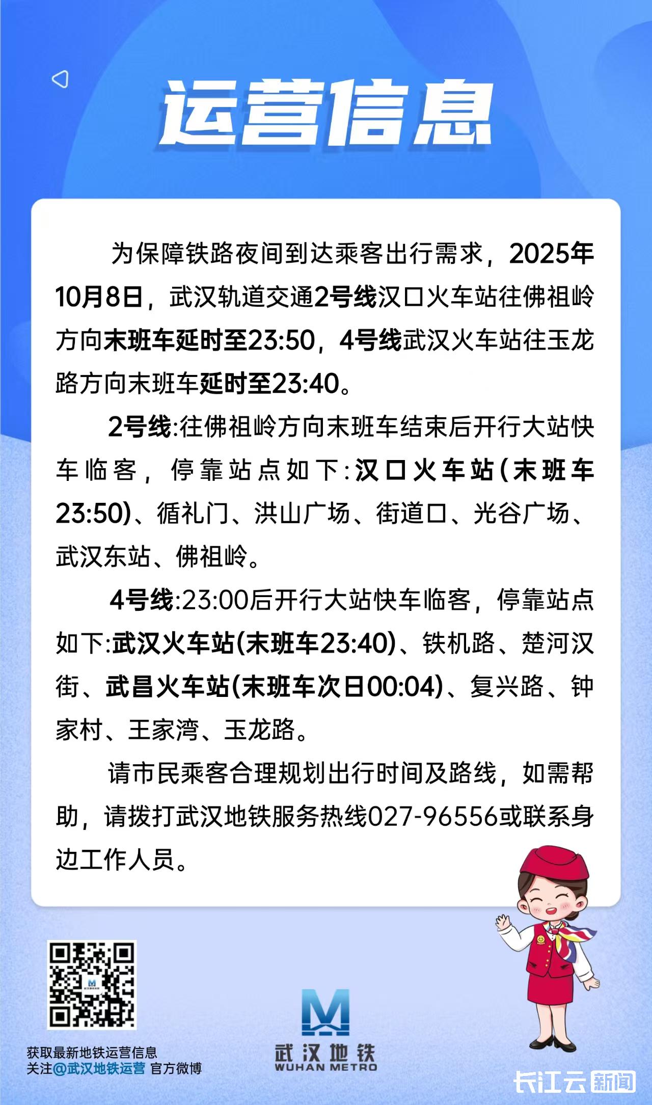 长江云新闻记者从武汉地铁运营公司获悉,为保障铁路夜间到达乘客出行需求,今日(10月8日),武汉轨道交通2号线汉口火车站往佛祖岭方向末班车延时至23:50,4号线武汉火车站往玉龙路方向末班车延时至23:40。