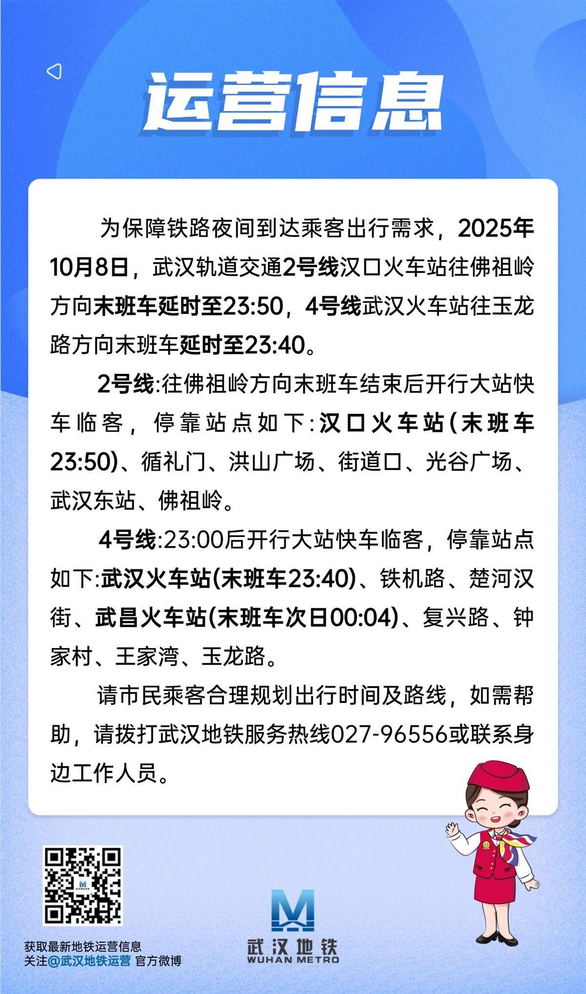 深夜返程不慌!10月8日,武汉地铁发布运营信息:今晚2、4号线延时运营接市民返程。