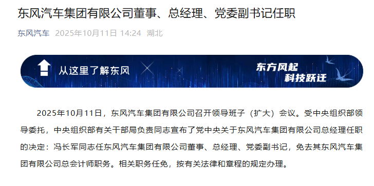 2025年10月11日,东风汽车集团有限公司召开领导班子(扩大)会议。受中央组织部领导委托,中央组织部有关干部局负责同志宣布了党中央关于东风汽车集团有限公司总经理任职的决定:冯长军同志任东风汽车集团有限公司董事、总经理、党委副书记,免去其东风汽车集团有限公司总会计师职务。相关职务任免,按有关法律和章程的规定办理。