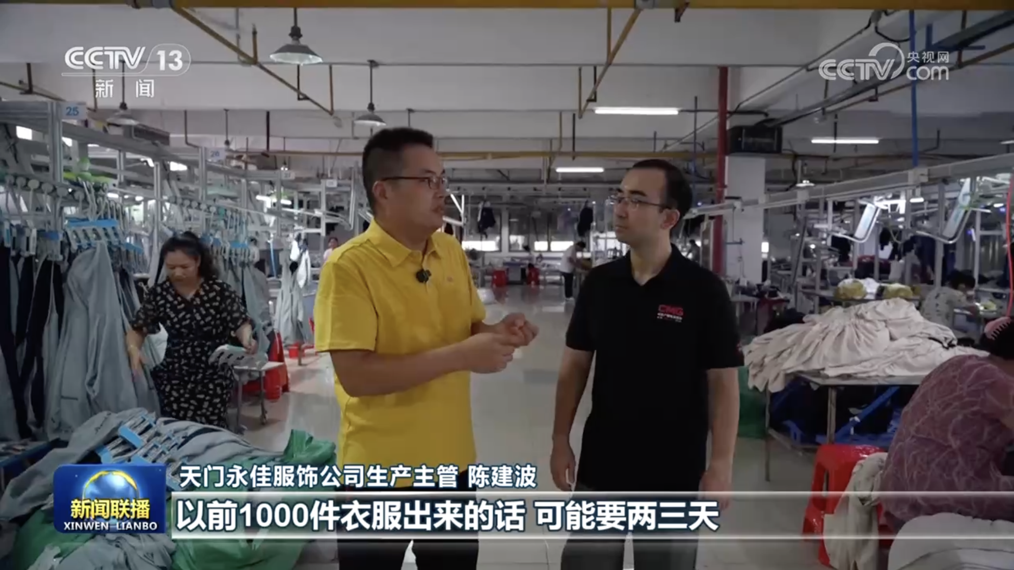 天门永佳服饰公司生产主管 陈建波:以前1000件衣服出来的话,可能要两三天,现在1000件衣服从早上挂片,我两个小时就可以出到成品。