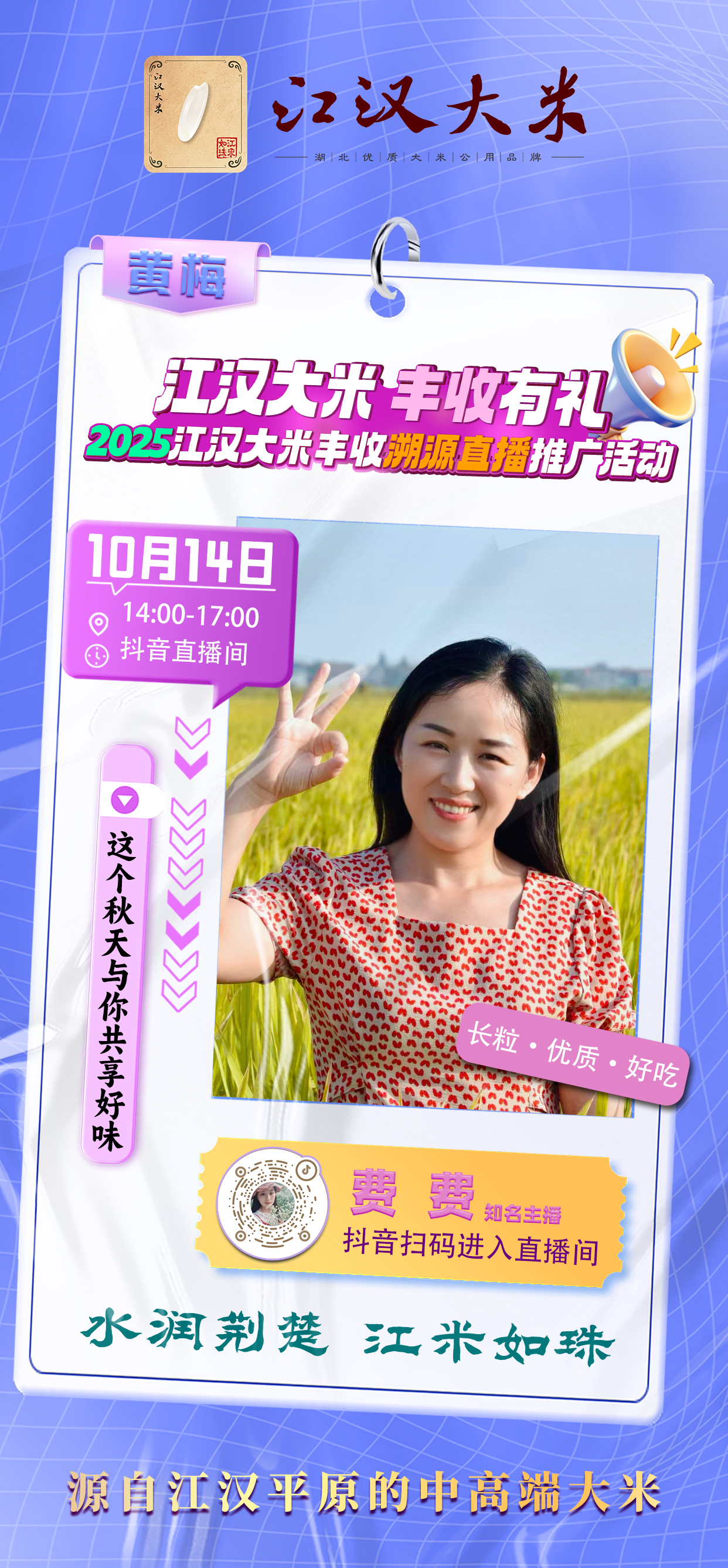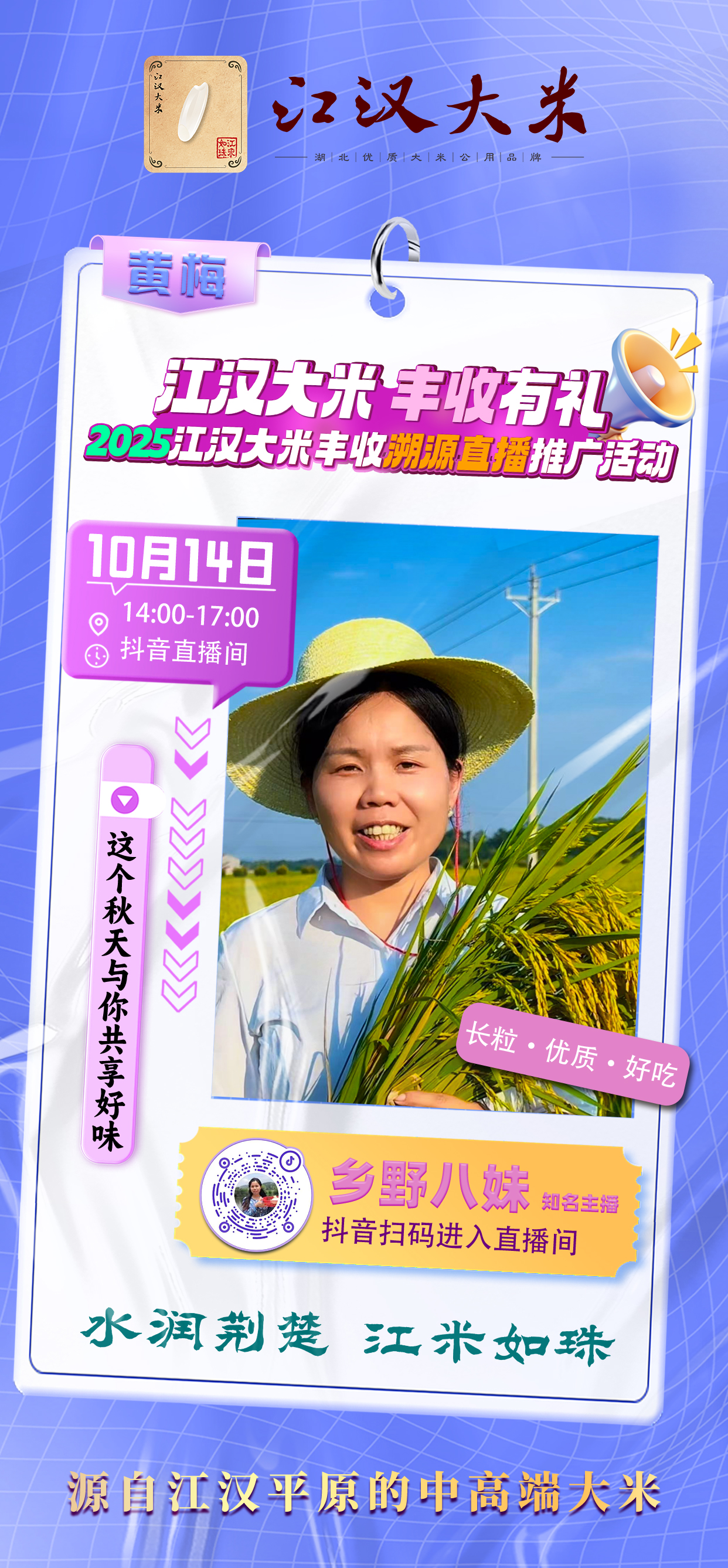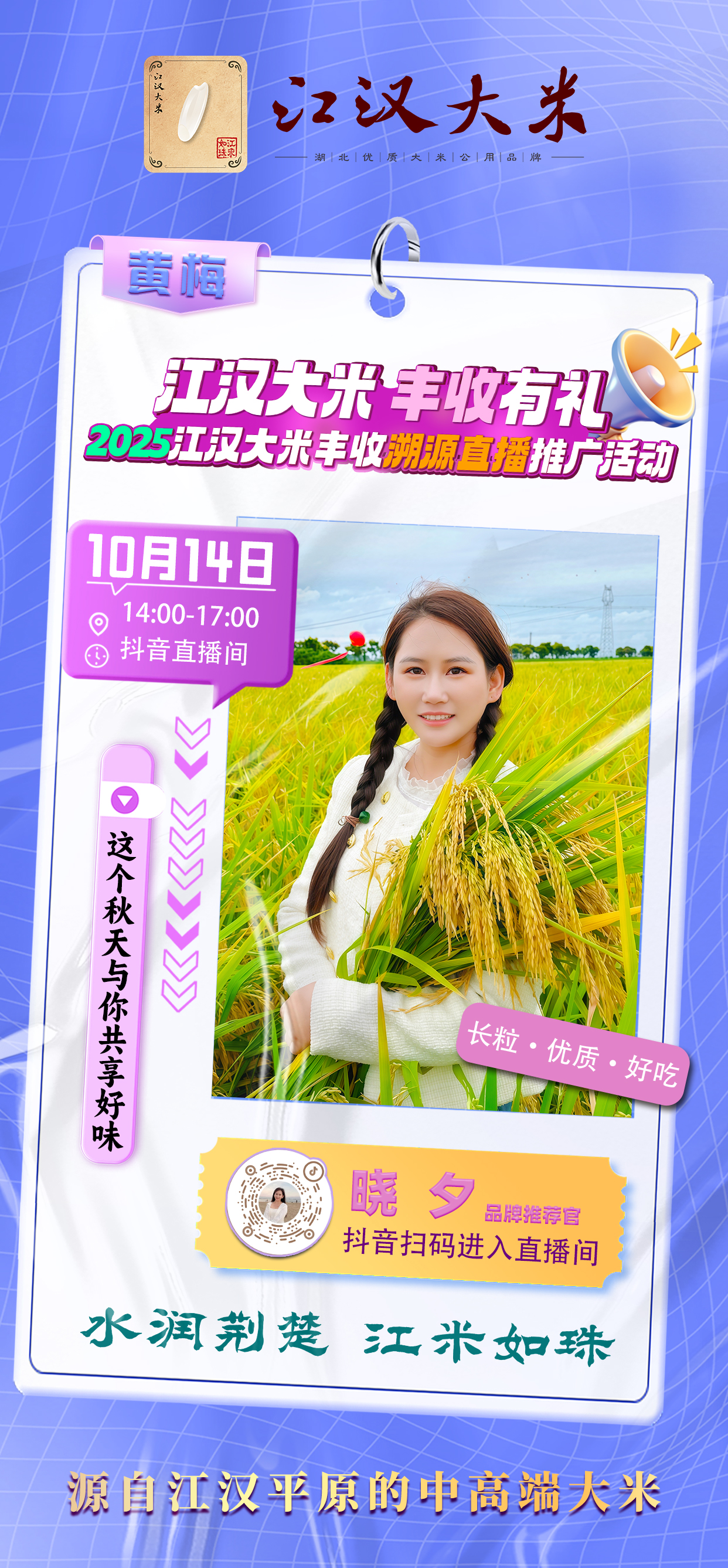 本次直播选址江汉大米黄梅核心种植基地,晓夕、爱做饭的胡子锅、乡野八妹、梅晓新、洪湖王文娟、费费六位知名主播将组成“溯源直播团”,用镜头全景呈现万亩良田的丰收盛景--金黄稻穗随风起伏的壮阔画面、稻穗颗粒饱满的细节特写、农户收割新稻的鲜活场景,都将通过直播间传递给全国观众,让大家沉浸式感受江汉平原的自然馈赠与农耕文化。、