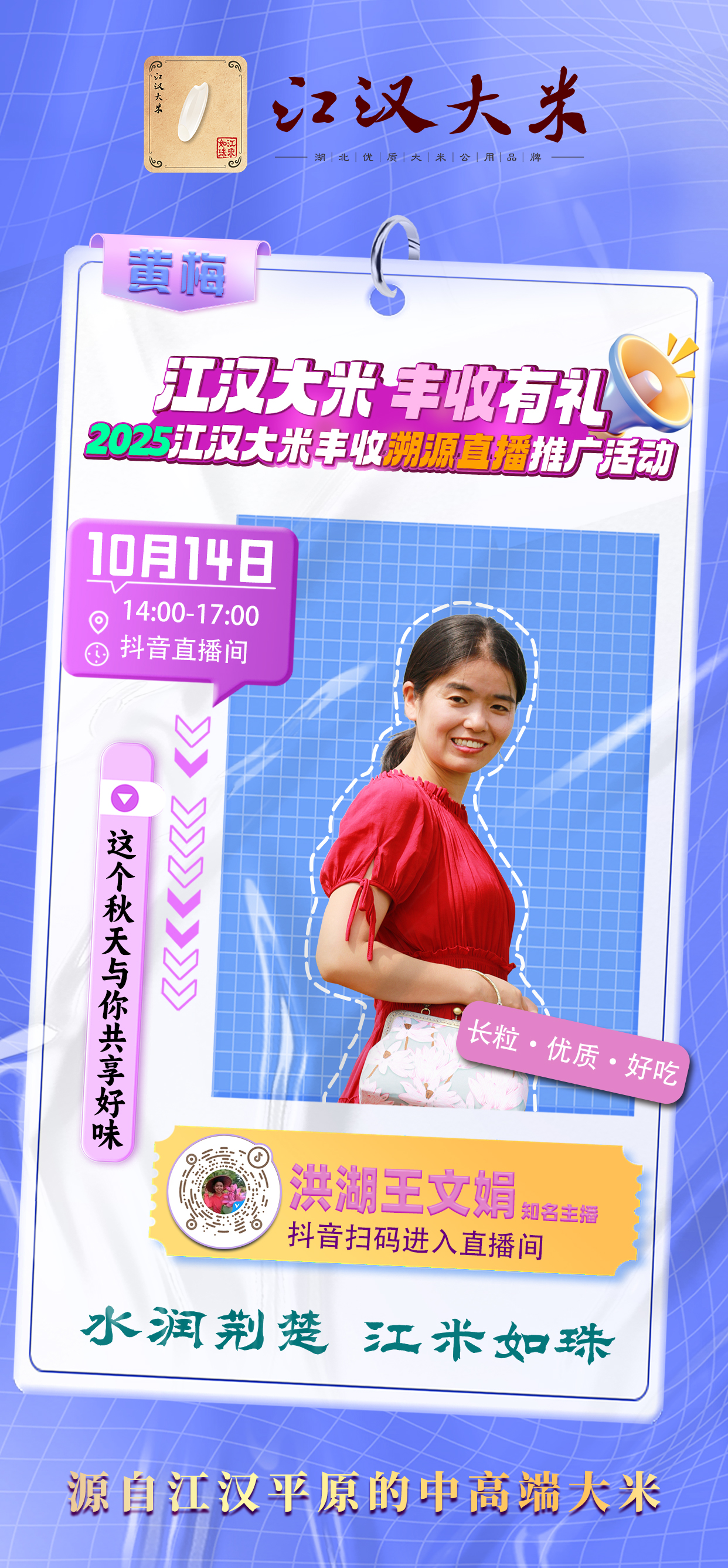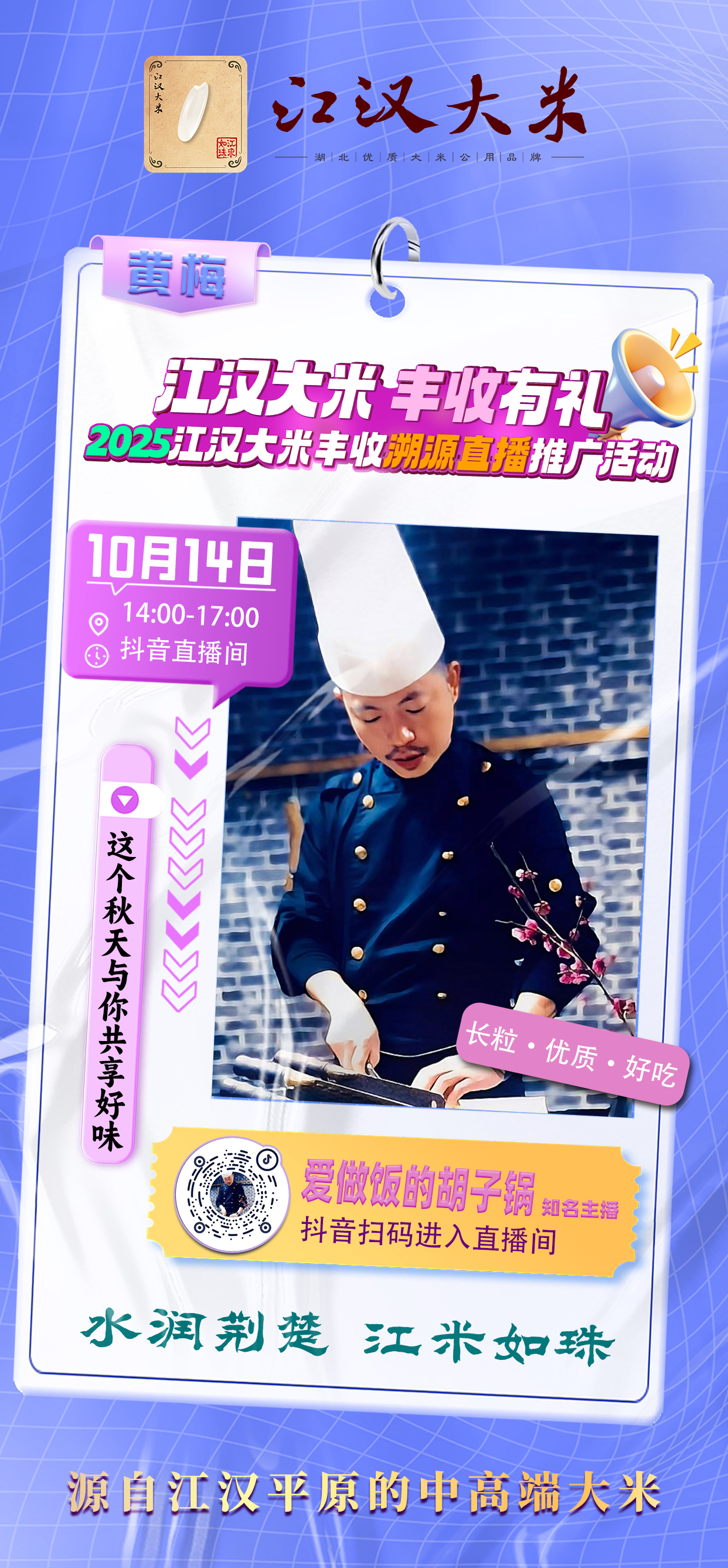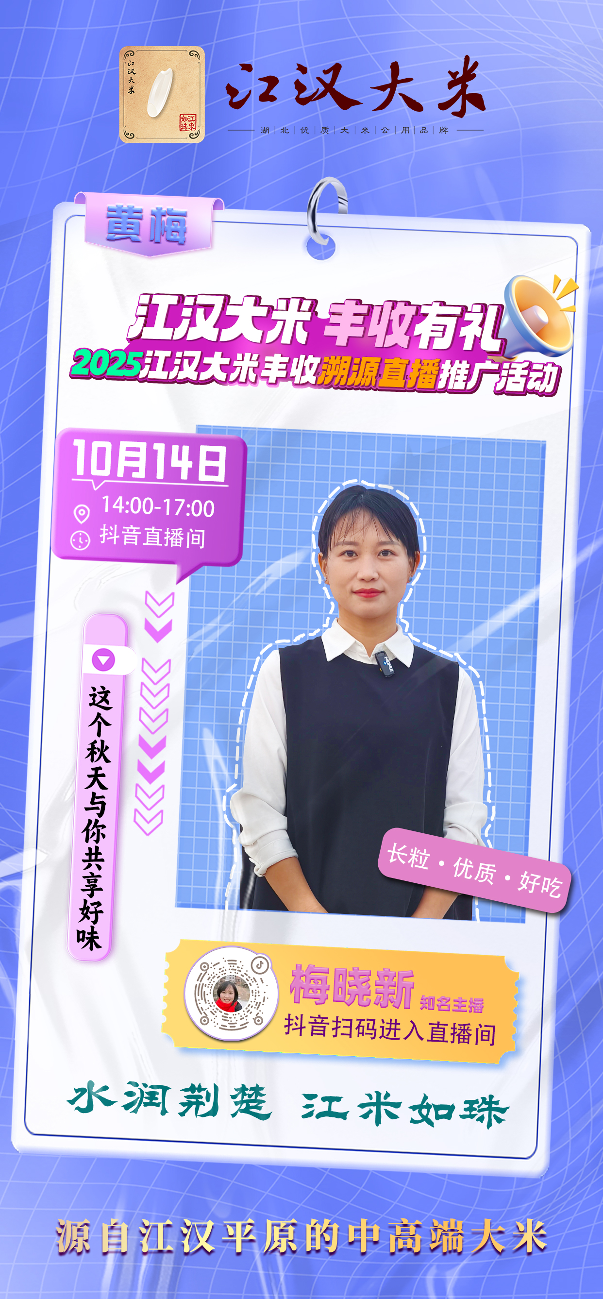 本次直播选址江汉大米黄梅核心种植基地,晓夕、爱做饭的胡子锅、乡野八妹、梅晓新、洪湖王文娟、费费六位知名主播将组成“溯源直播团”,用镜头全景呈现万亩良田的丰收盛景--金黄稻穗随风起伏的壮阔画面、稻穗颗粒饱满的细节特写、农户收割新稻的鲜活场景,都将通过直播间传递给全国观众,让大家沉浸式感受江汉平原的自然馈赠与农耕文化。、