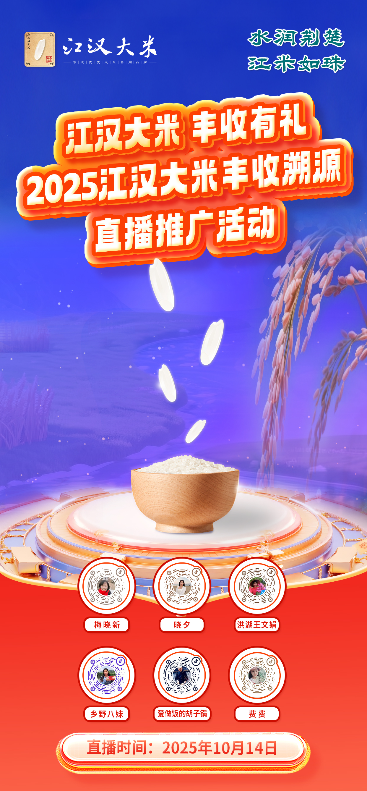 2025年江汉新米新鲜上市,10月14日下午14:00,锁定主播直播间,跟着主播一同溯源江汉好米、抢购当季新粮,把秋日的丰收滋味与安心品质带回家!!