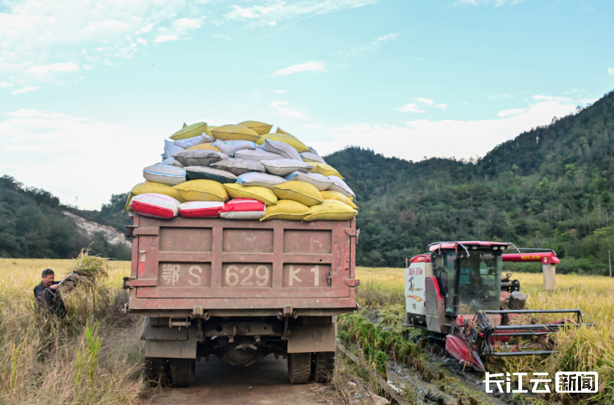 10月13日,十堰市竹山县擂鼓镇董家沟村150亩“旱改水”项目区内的富硒晚稻丰产熟透,该村组织收割机械乘着天晴,抢收稻谷,装运至护驾粮食机烘车间,连夜烘干,确保颗粒归仓。