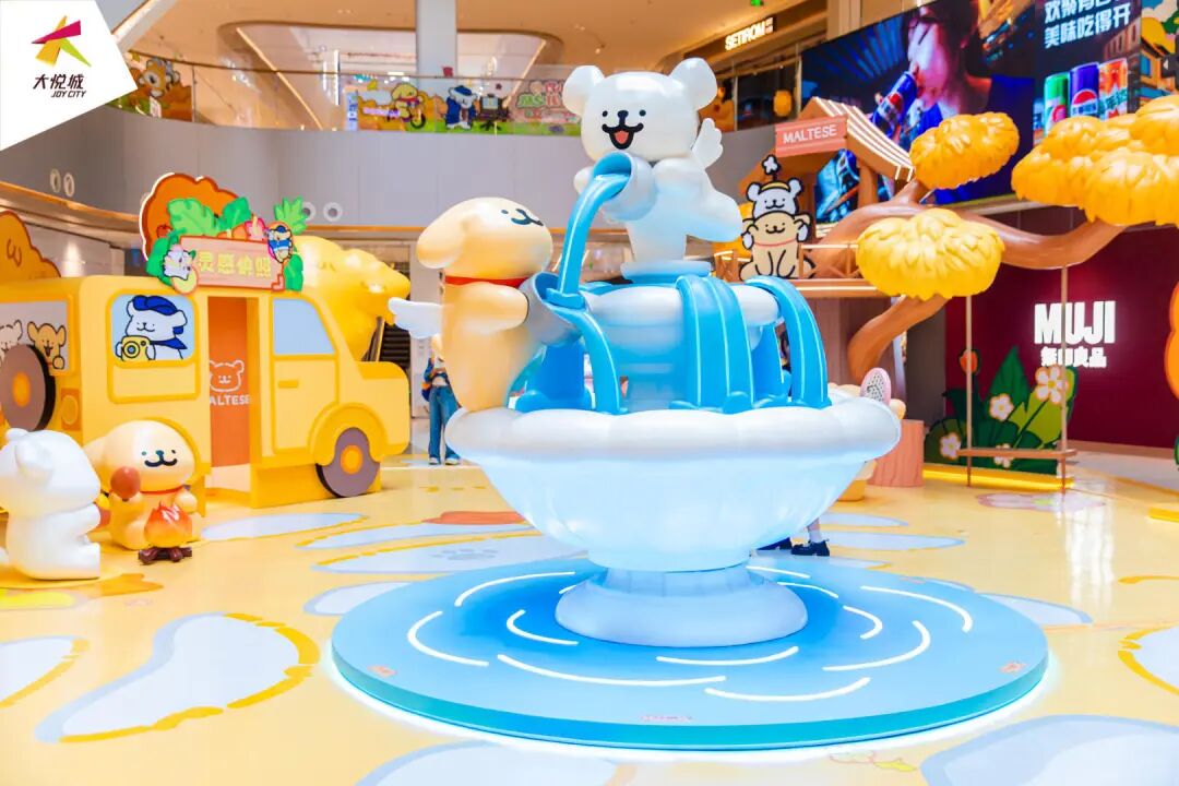 武汉大悦城一楼中庭,是个300㎡的线条小狗乐园,小白和小鸡毛出没在喷泉、篝火、修叶园等地方。
