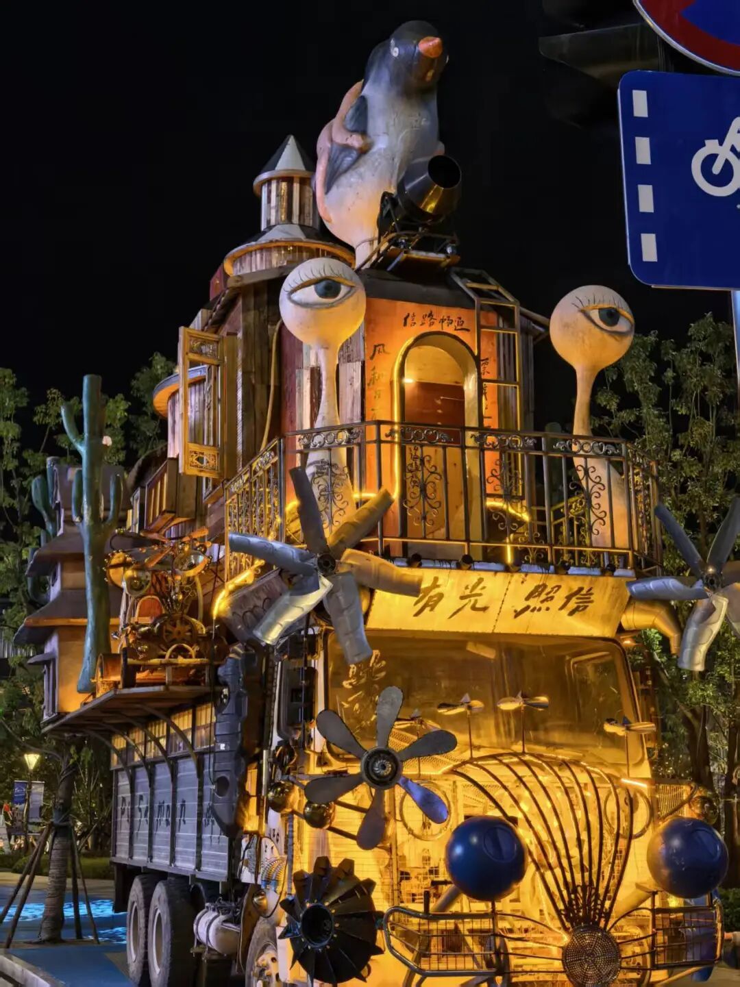 所有的展品,都是用废弃材料手工创造,混搭出童话小屋群落、10米双层邮差车、10+辆魔幻怪车。晴天和夜晚都好出片!