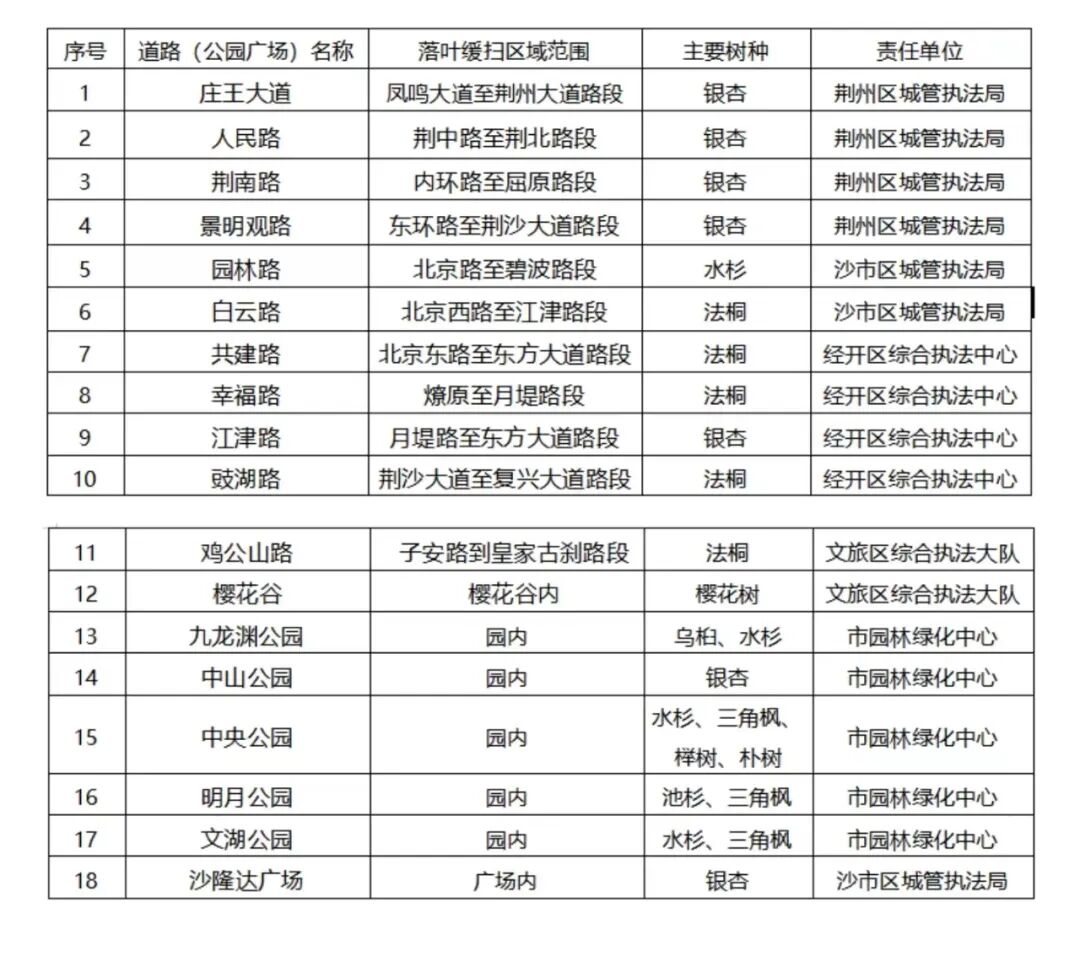 城管、园林、环卫部门将按照“雨后整体清理、腐坏及时清理、堆积适度清理”原则,在保障市民出行安全的前提下,做好落叶缓扫区域的日常保洁工作。同时,将制作宣传海报,设置便民休憩、拍照打卡点等便民服务场景,打造具有荆州特色的落叶景观活动。