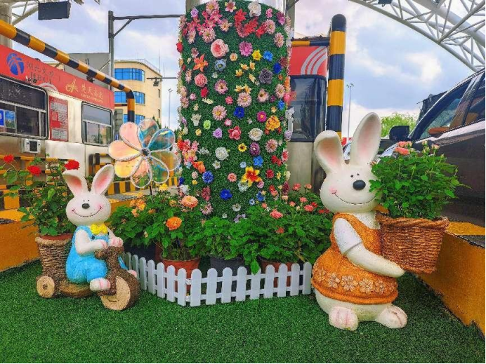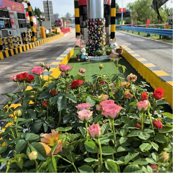车缓缓停靠在收费窗口前,我摇下车窗,一股淡淡的花香随风飘来。收费岛的花箱整整齐齐地排列着,绿叶红花与岗亭交相辉映,连护栏边都点缀着小巧的景观小品:多彩搭配、环形翠绿,甚至还有兔子蘑菇装饰,憨态可掬。每走几步,景致便换一番,真真是“移步换景”,让人忍不住多看几眼。