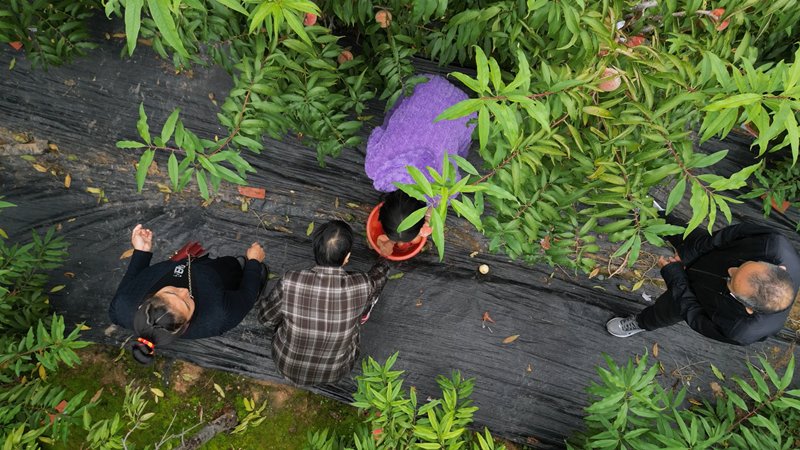 走进六谷村冬桃基地,连片的桃树枝繁叶茂,层层叠叠的绿叶下,一颗颗套袋的冬桃缀满枝头,果园内弥漫着桃子的香甜气息。游客们在桃树下来回穿梭,忙着采摘鲜果、拍照打卡。果农付朝卓正在桃树下忙着摘桃、装筐、运送,一派繁忙又喜悦的丰收景象。